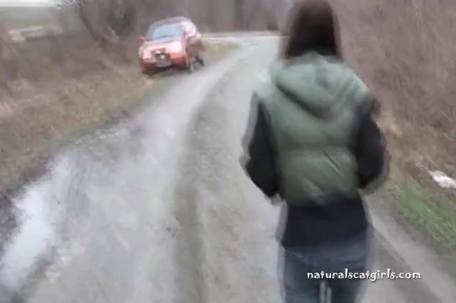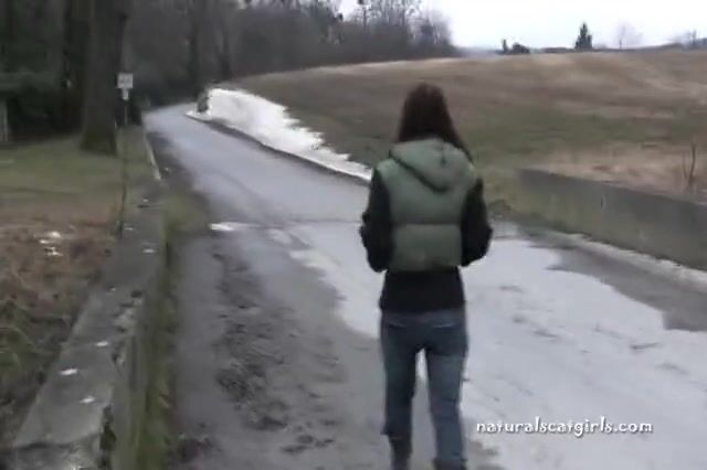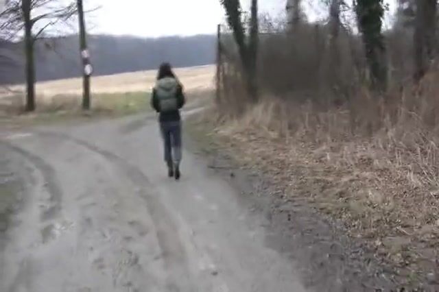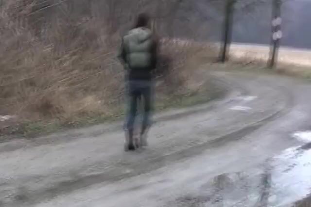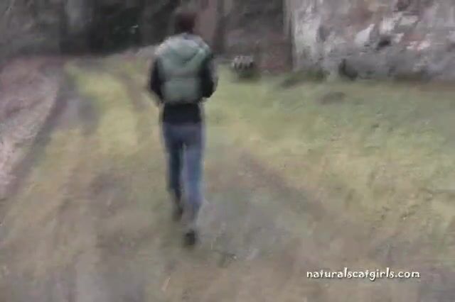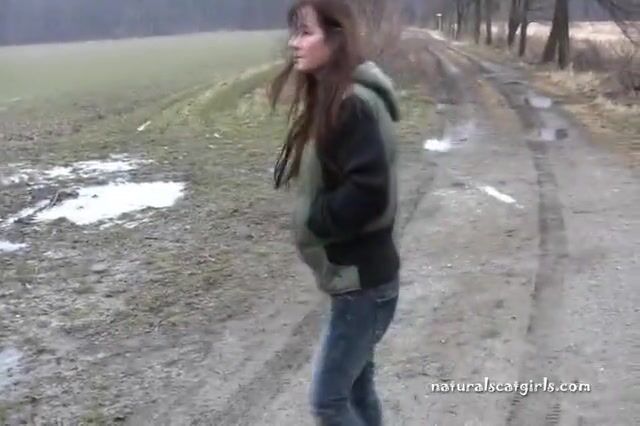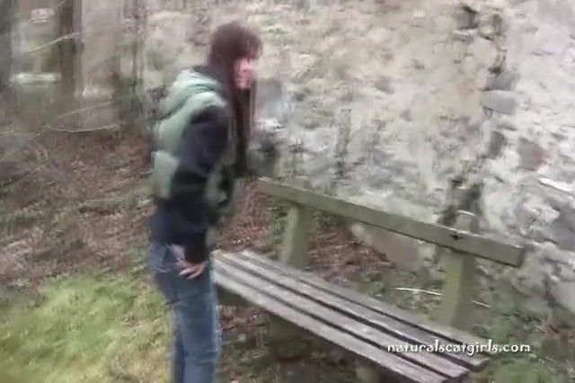 Girl shit and pissing on a bench by the stone wall - Pooping