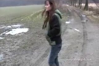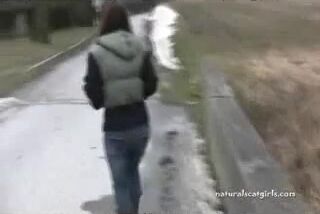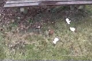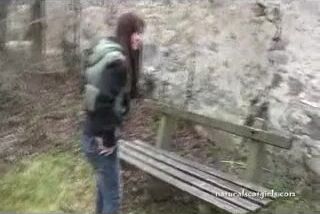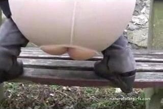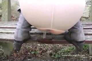 Girl shit and pissing on a bench by the stone wall _ Girls pooping indoor