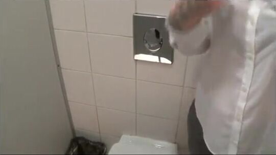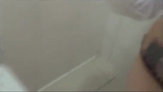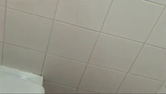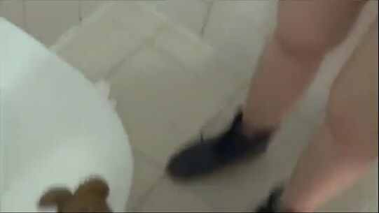 She kneels in the bathtub and poops