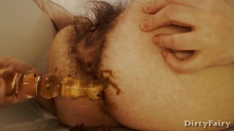Hairy lady's shitty anal dildo play