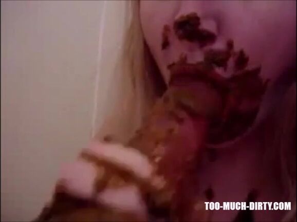 Dirty girl sucking and licking a shitty dildo