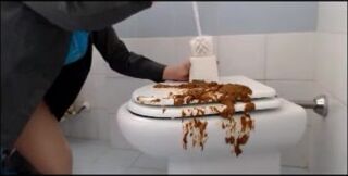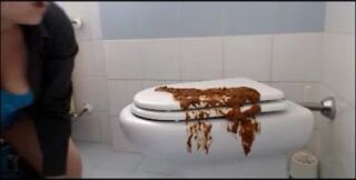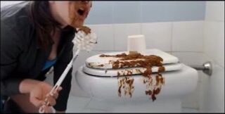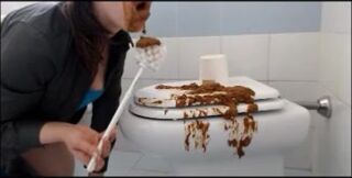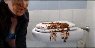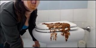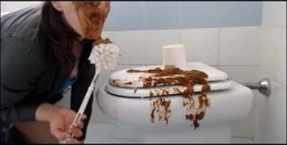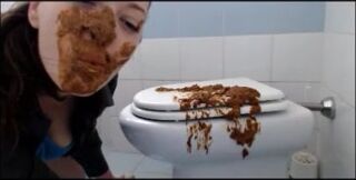 Brunette shitting on the cover of toilet then put her face on it