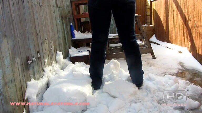 Pooping in a snowy back yard