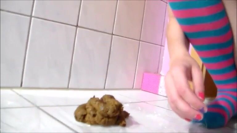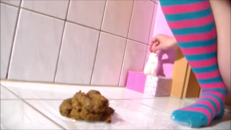 Skinny teen with long socks shitting on the floor