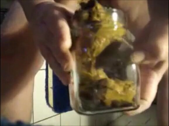 Big lady shitting in a jar and pissing