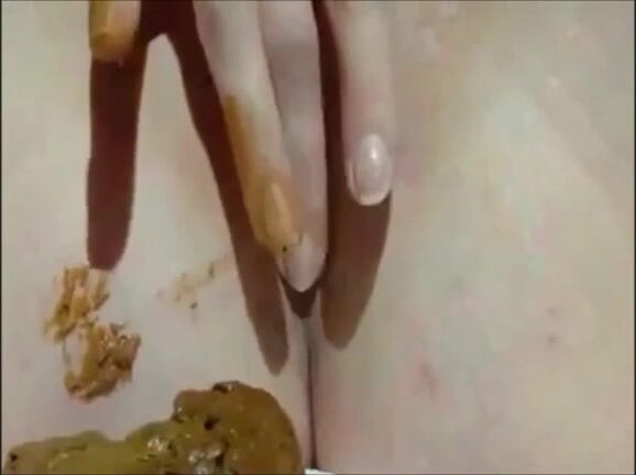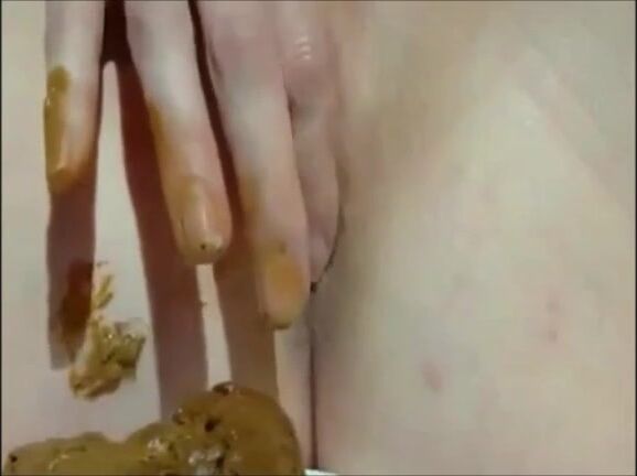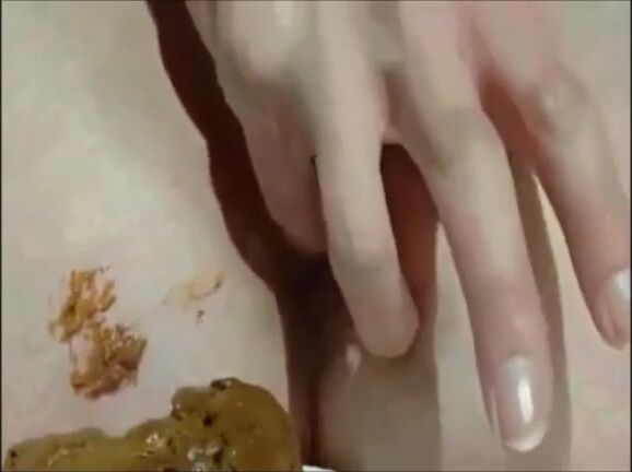 Shaved girl shitting closeup and fingering her pussy