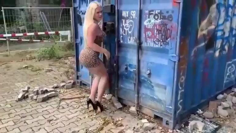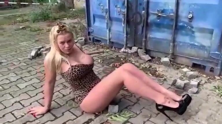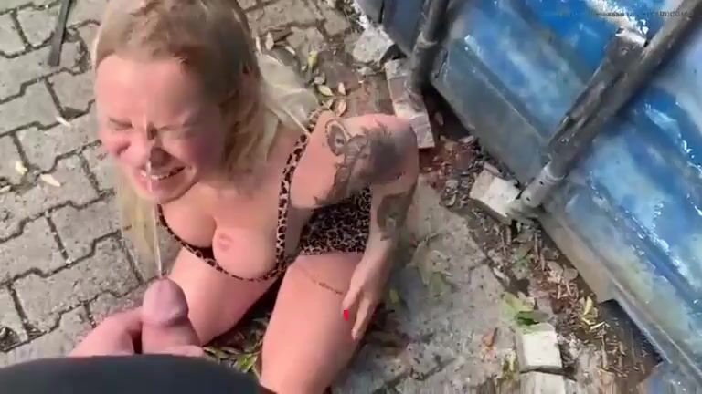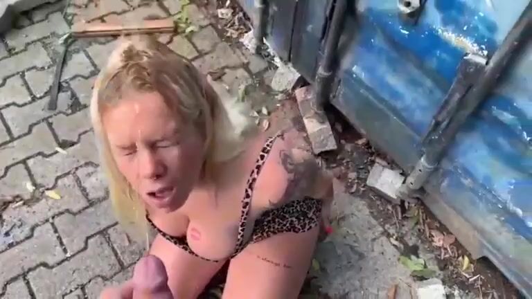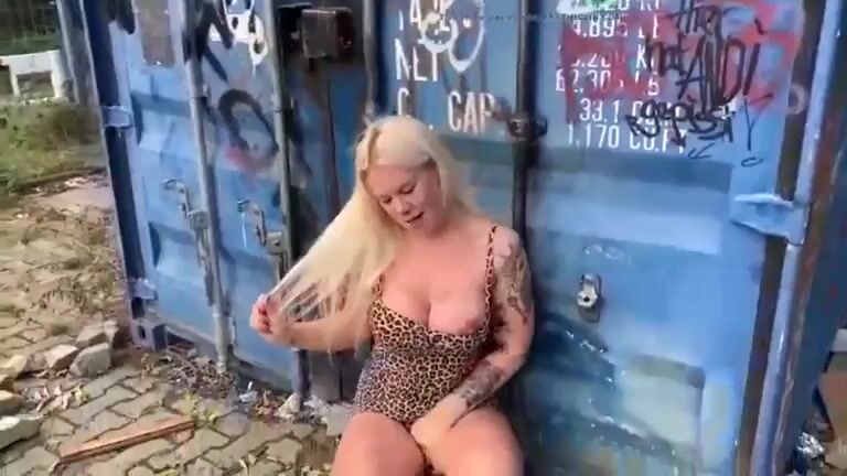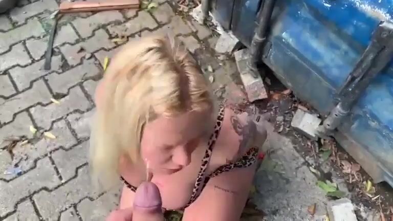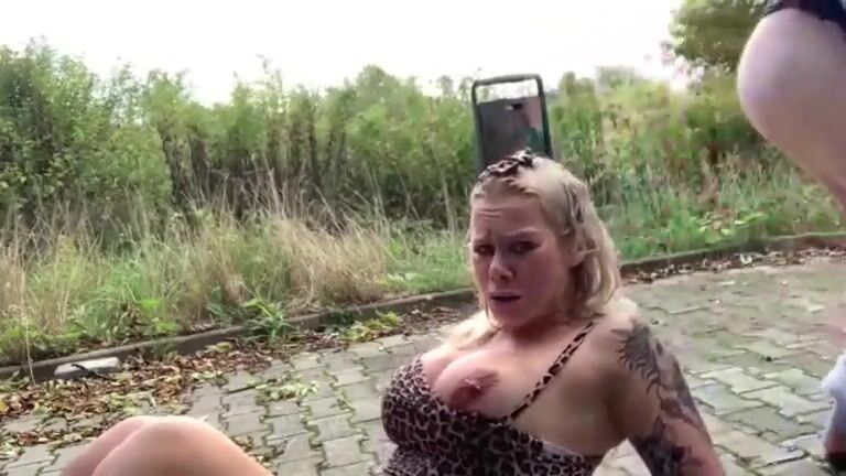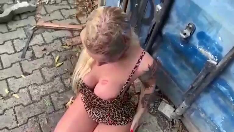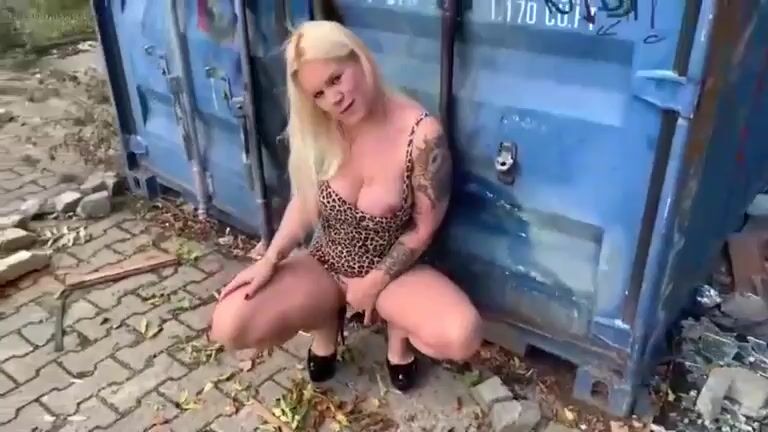 Busty Blonde receives on her head fresh shit and piss outdoors