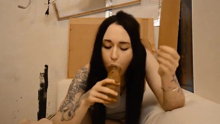 shit loving girl masturbates and tastes shitty dildo