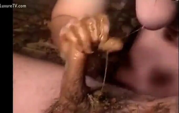MILF covers a cock with shit and then sucks it off