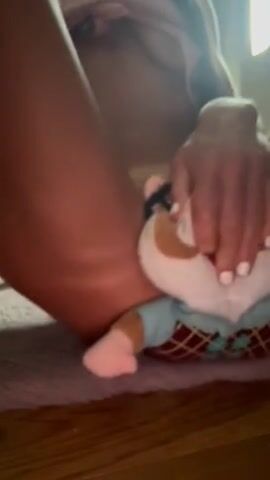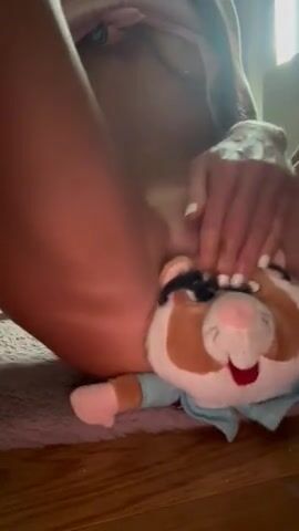 Tiny young slave riding her stuffed animal for Dad