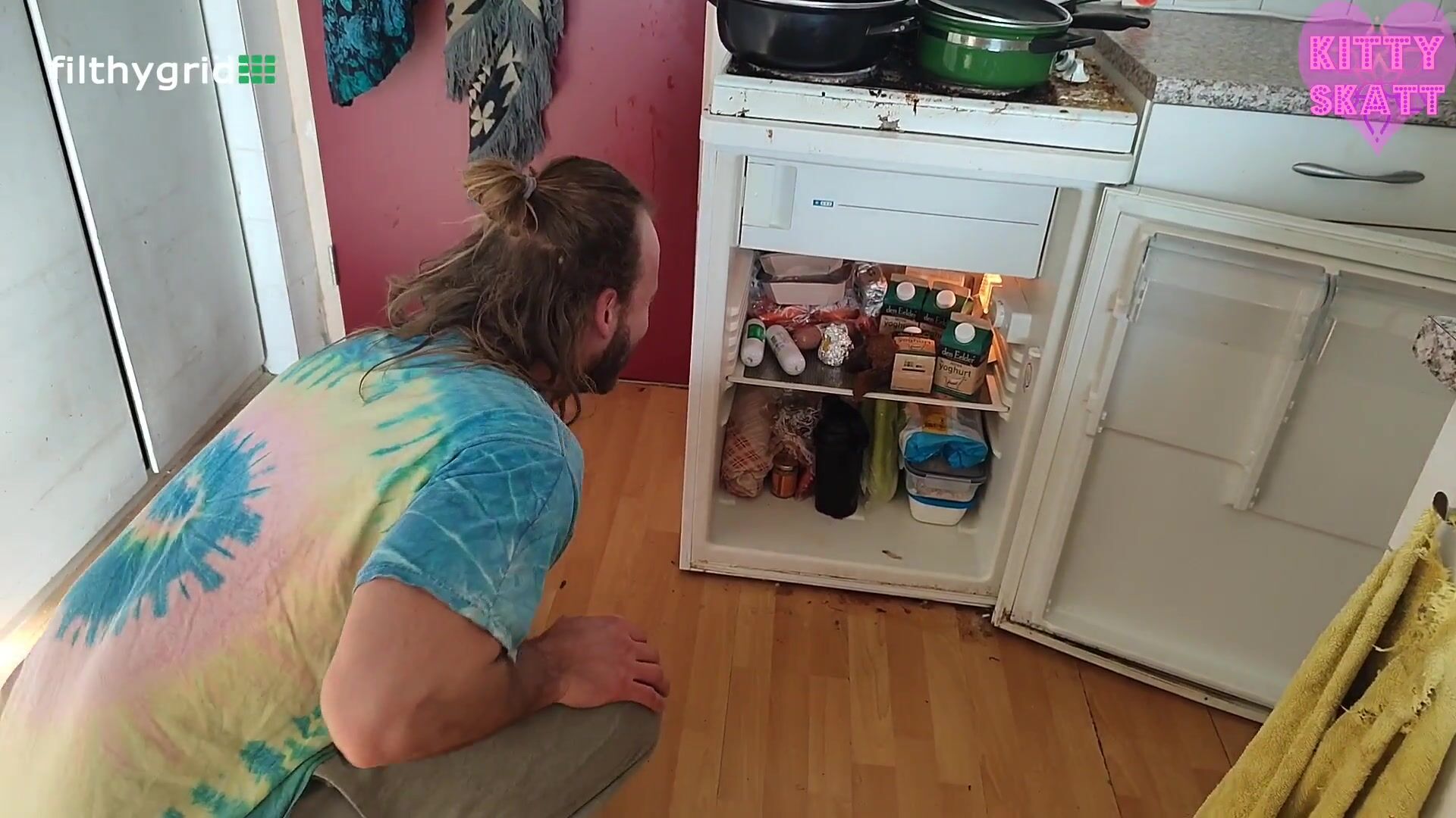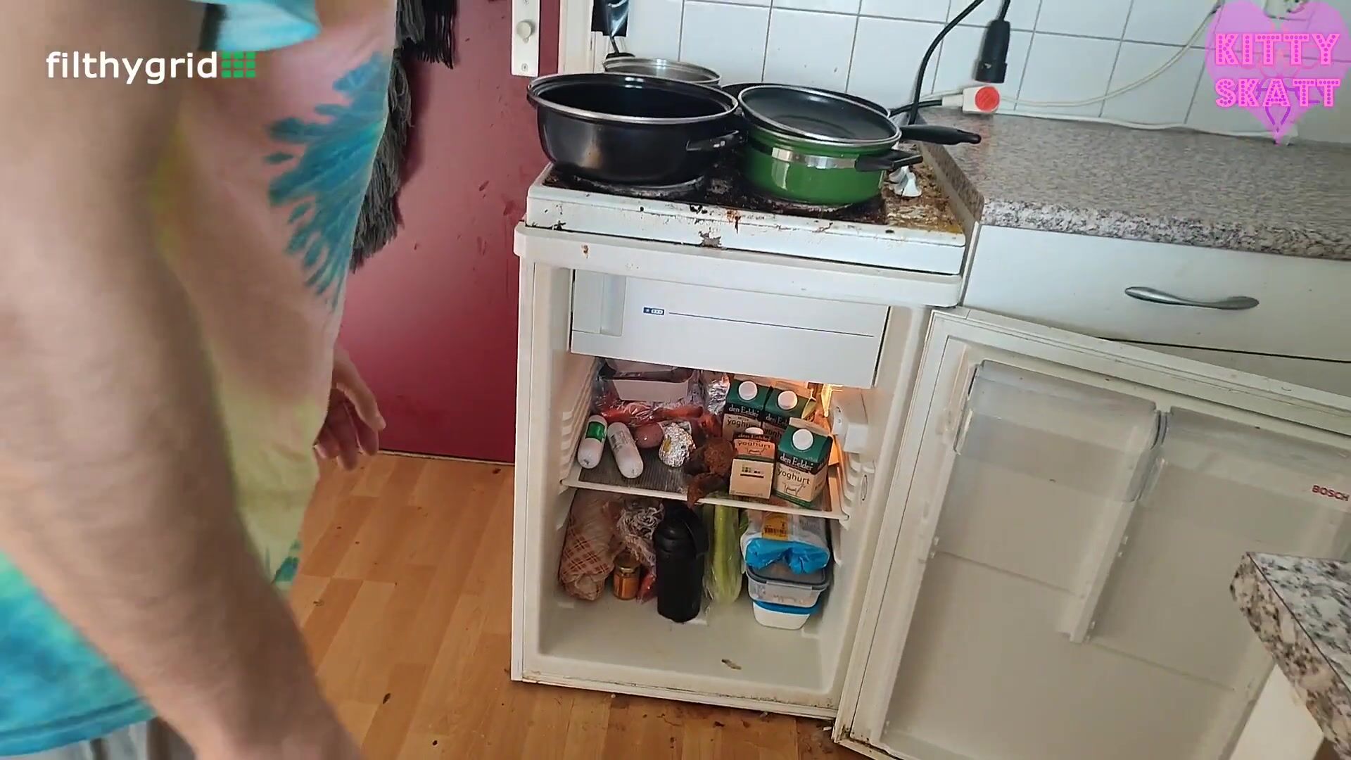 Kitty skatt big shit in his fridge to surprise him