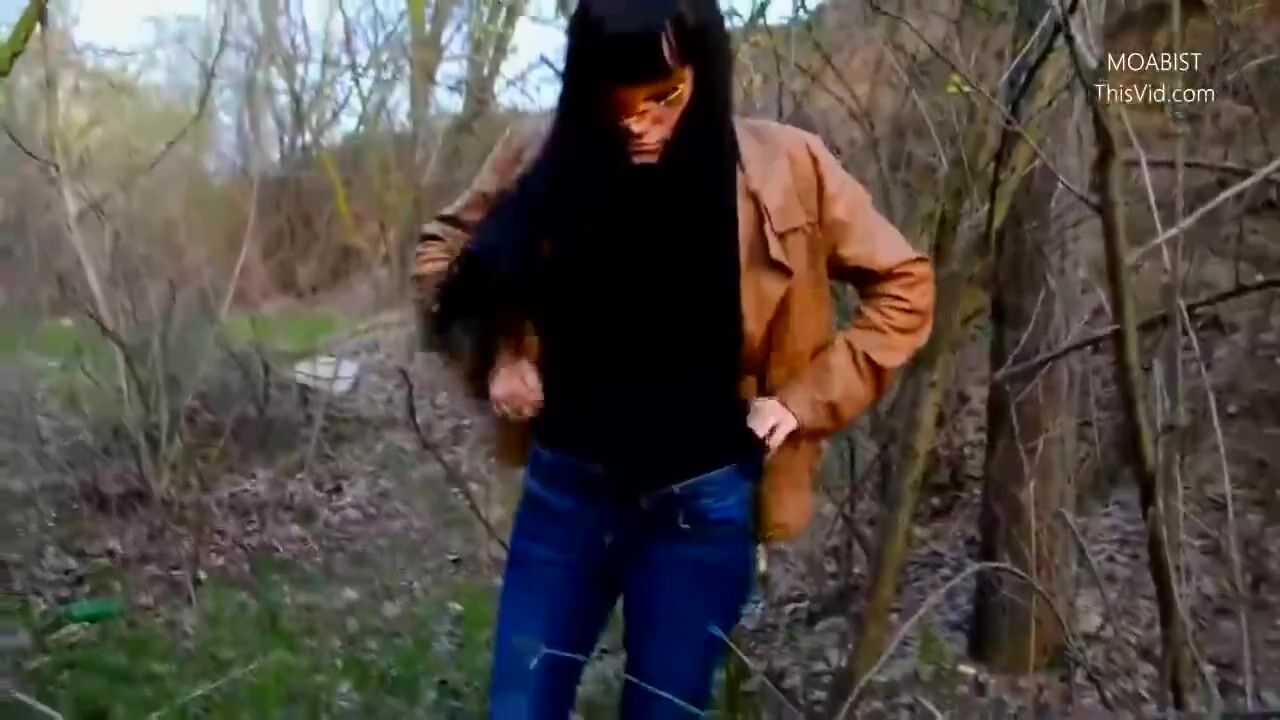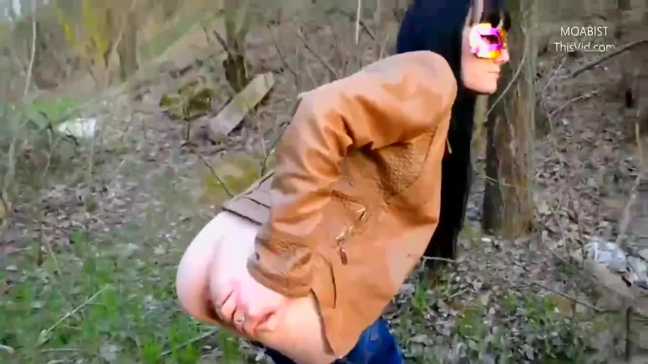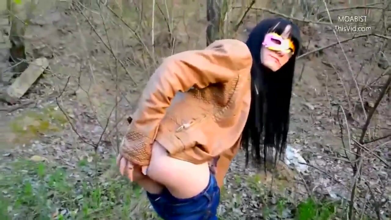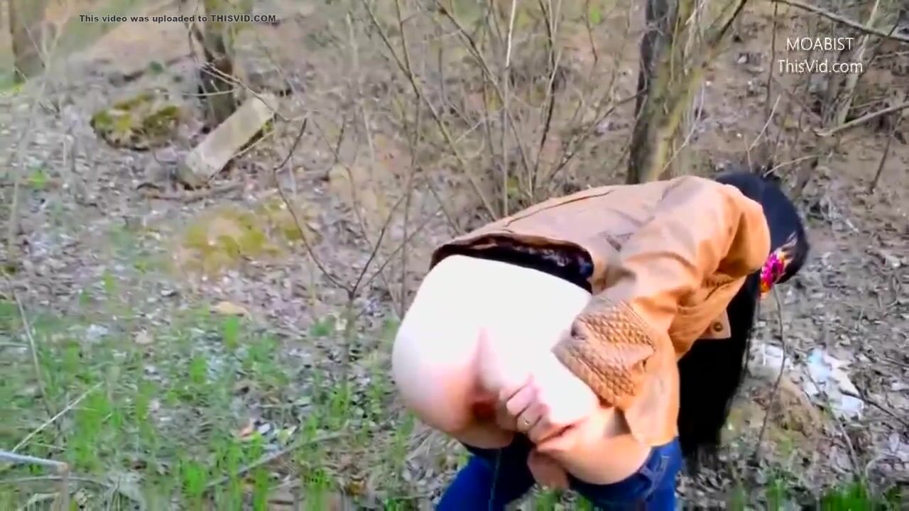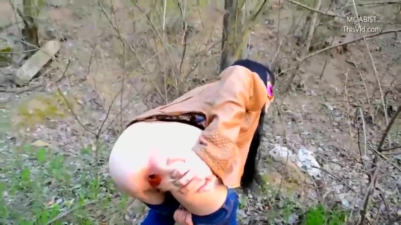 Public wood walking girl shits into panty and mast