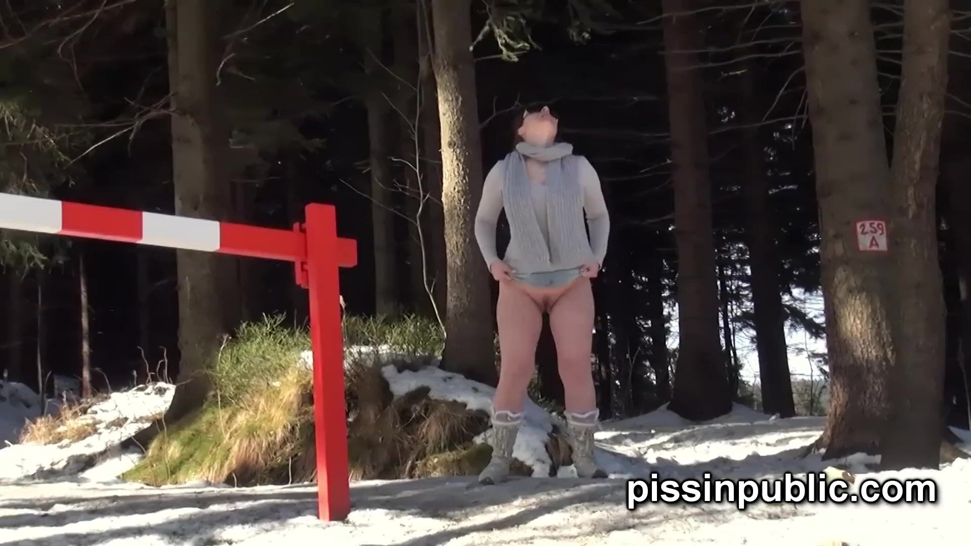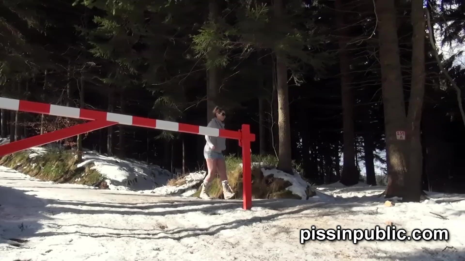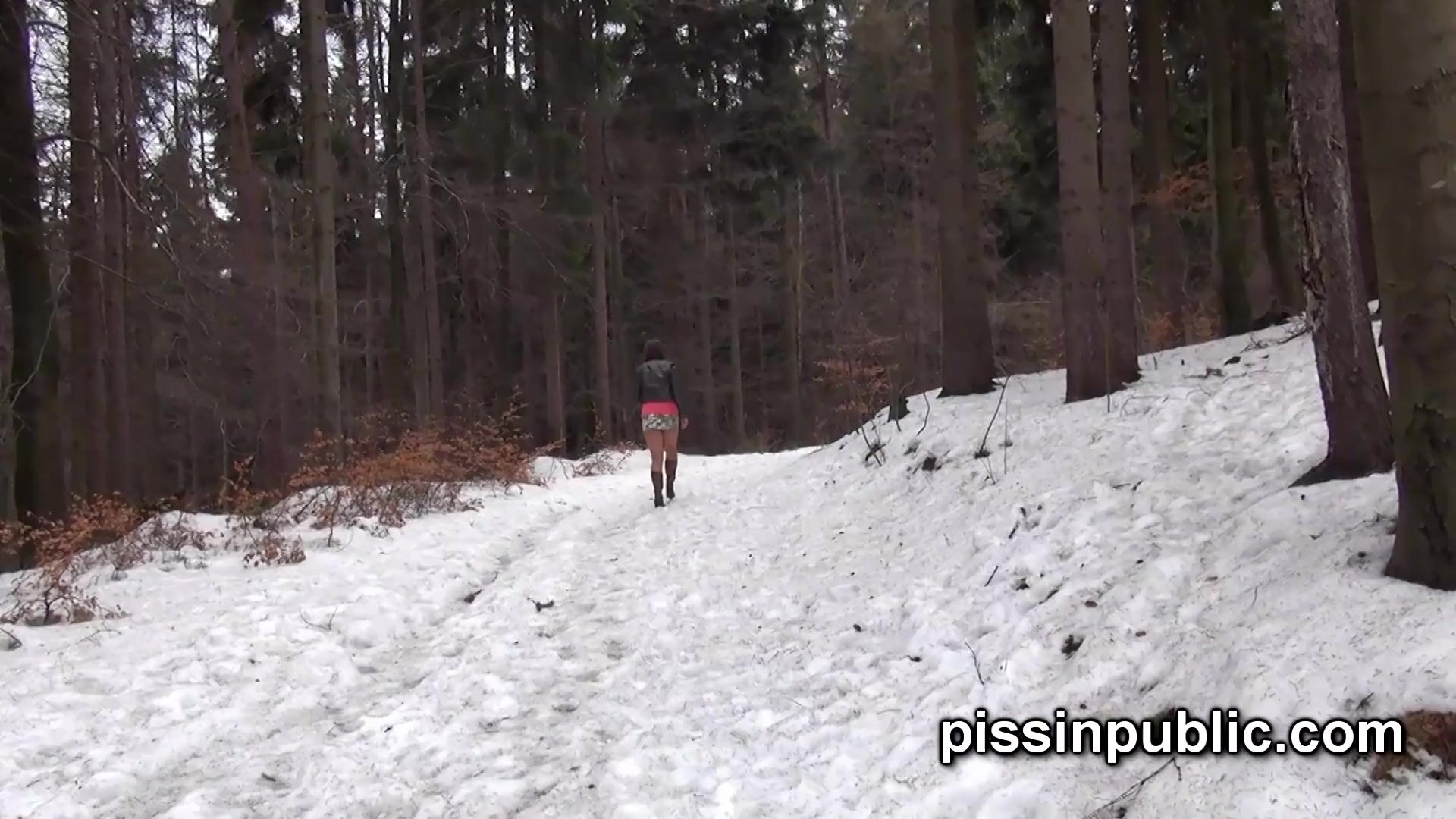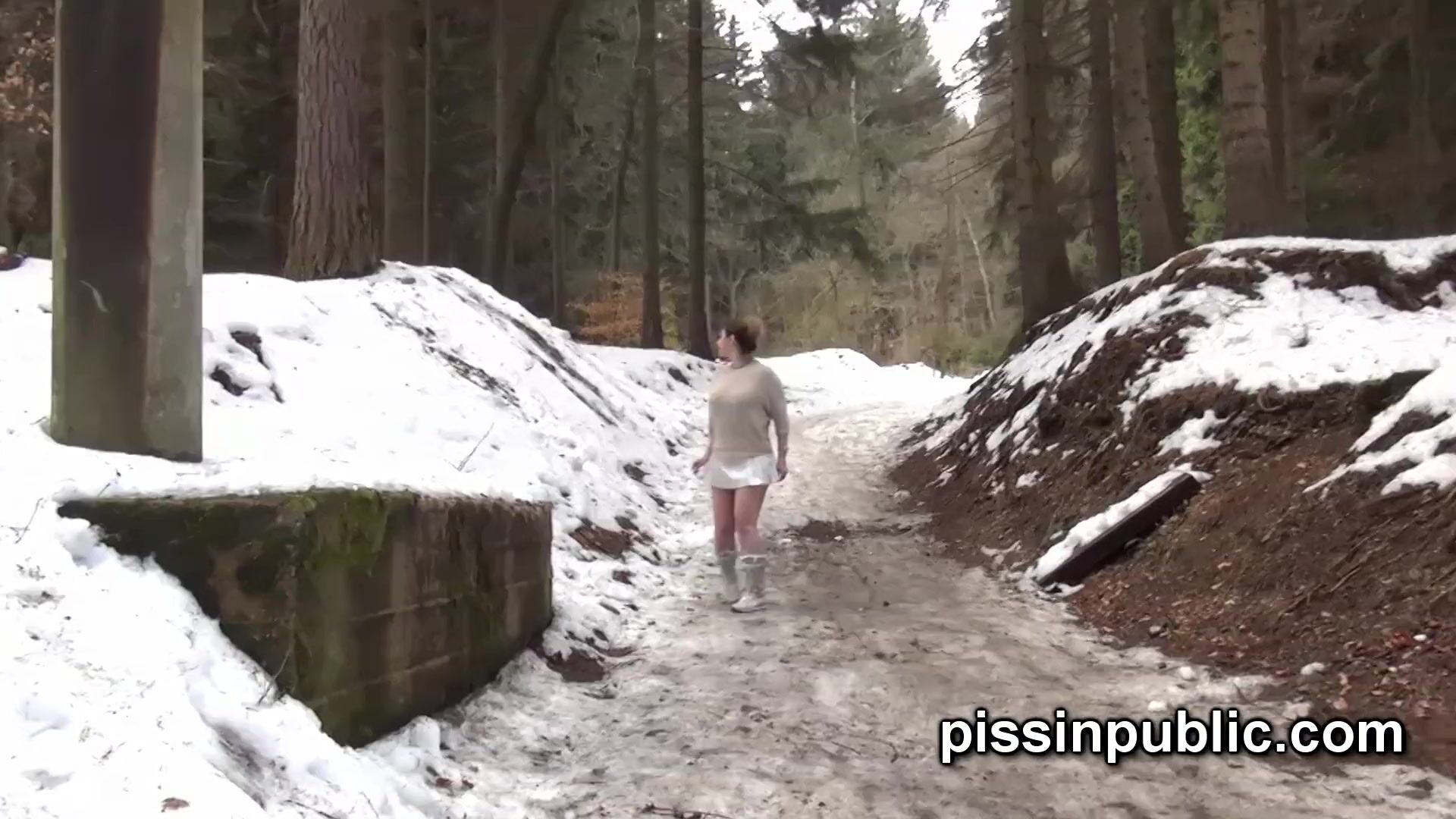 Girls in need skate around in the snow to find a proper place to have a pee