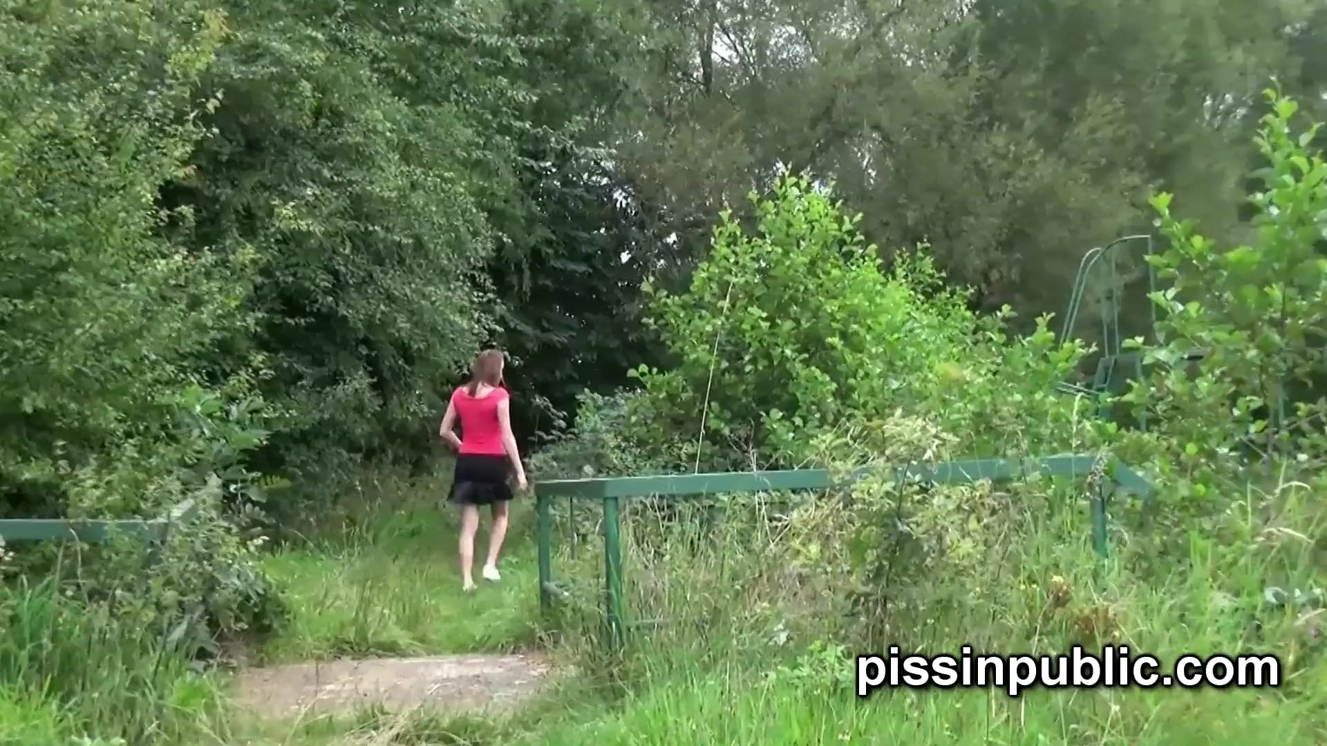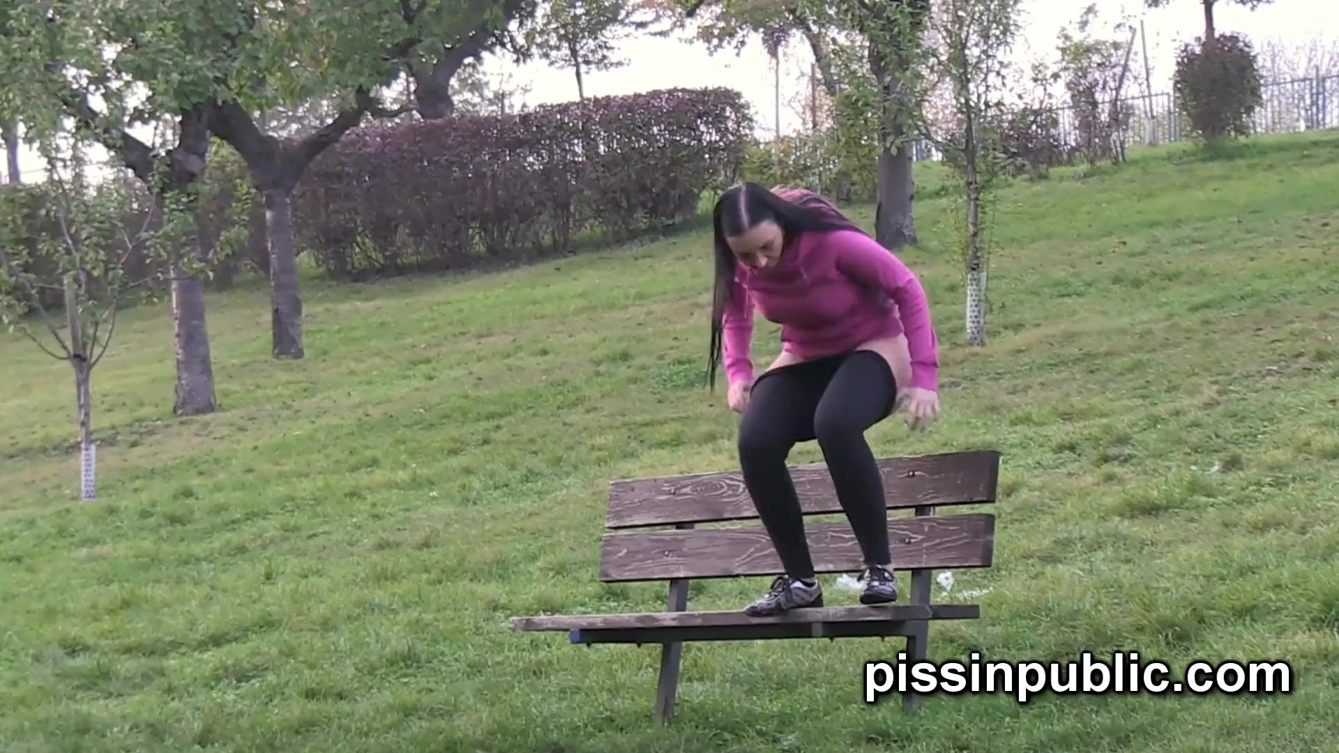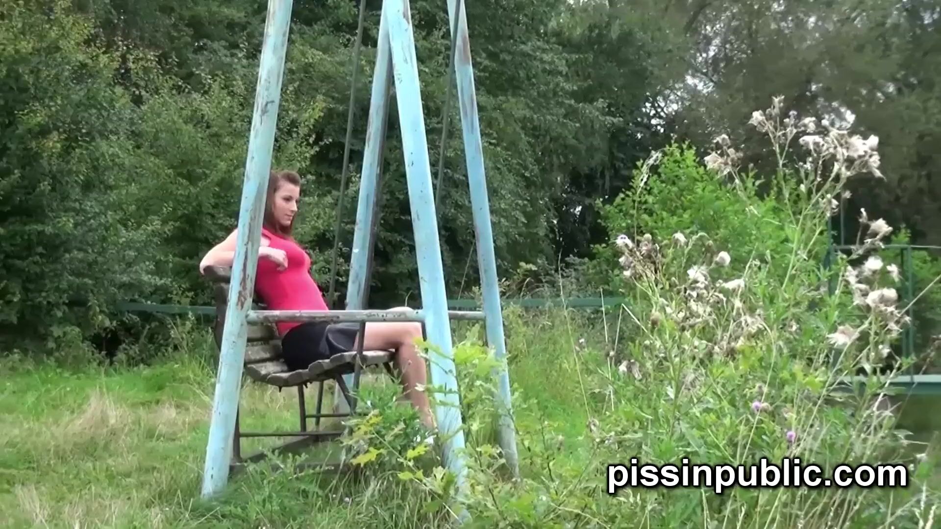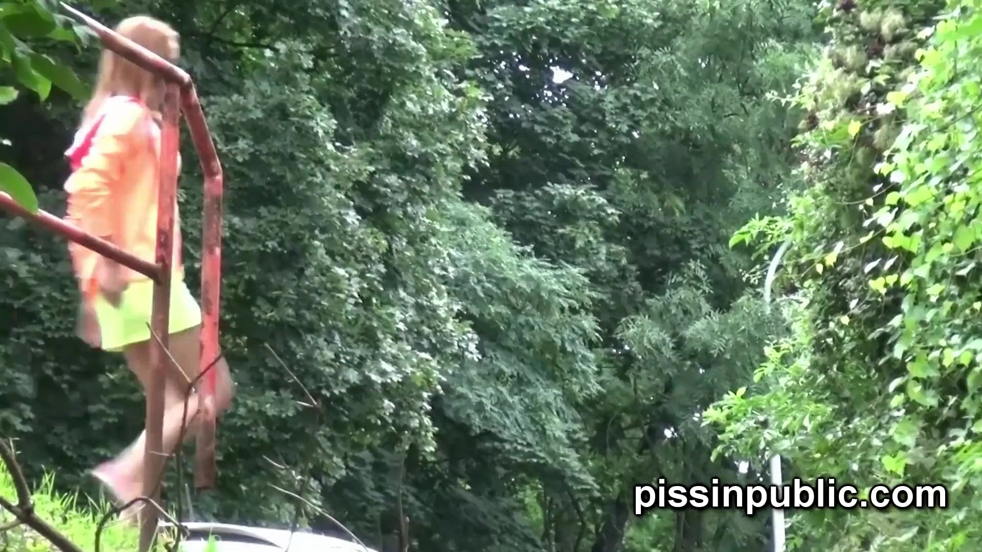 Peeing babes empty their bladders in a park being part of voyeur pee video
