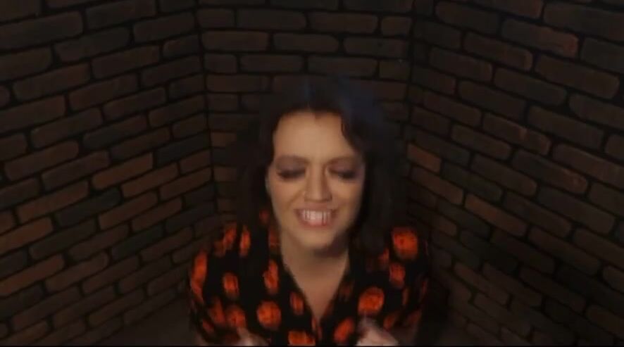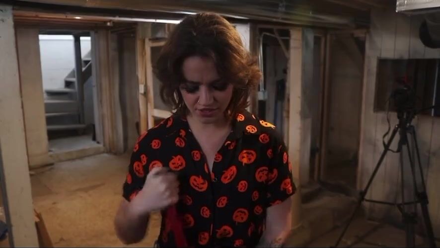 A women poops in a prop toilet during her audition
