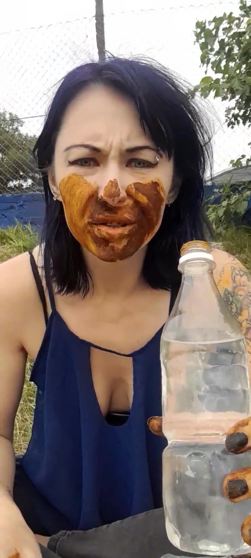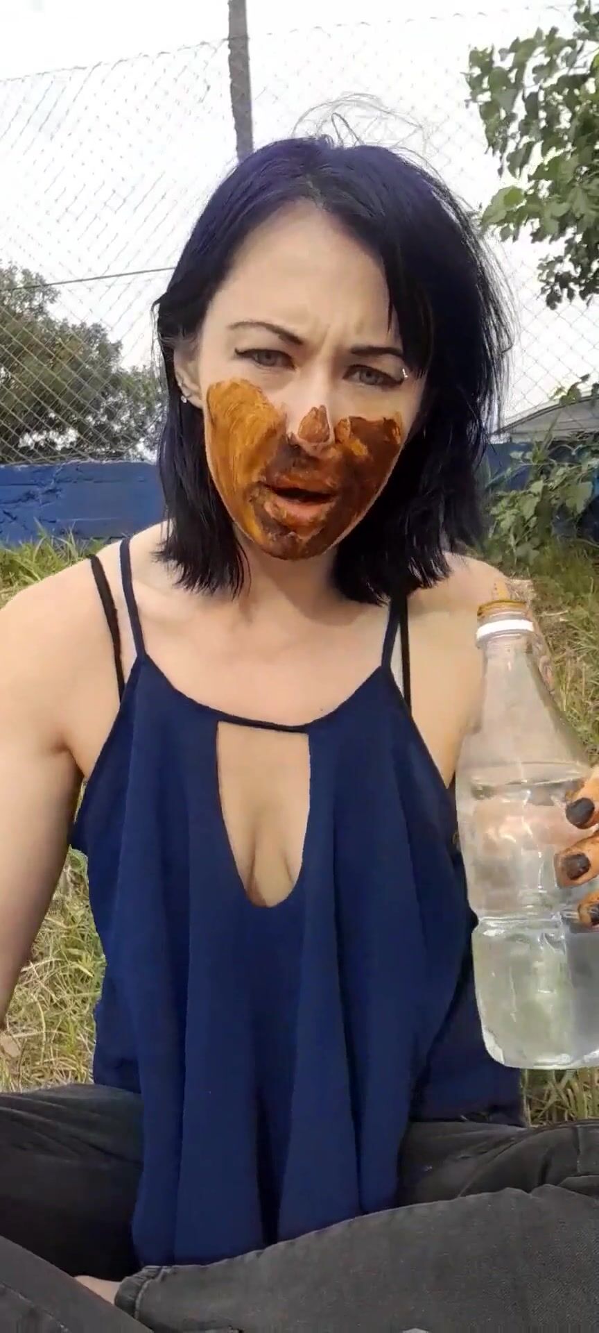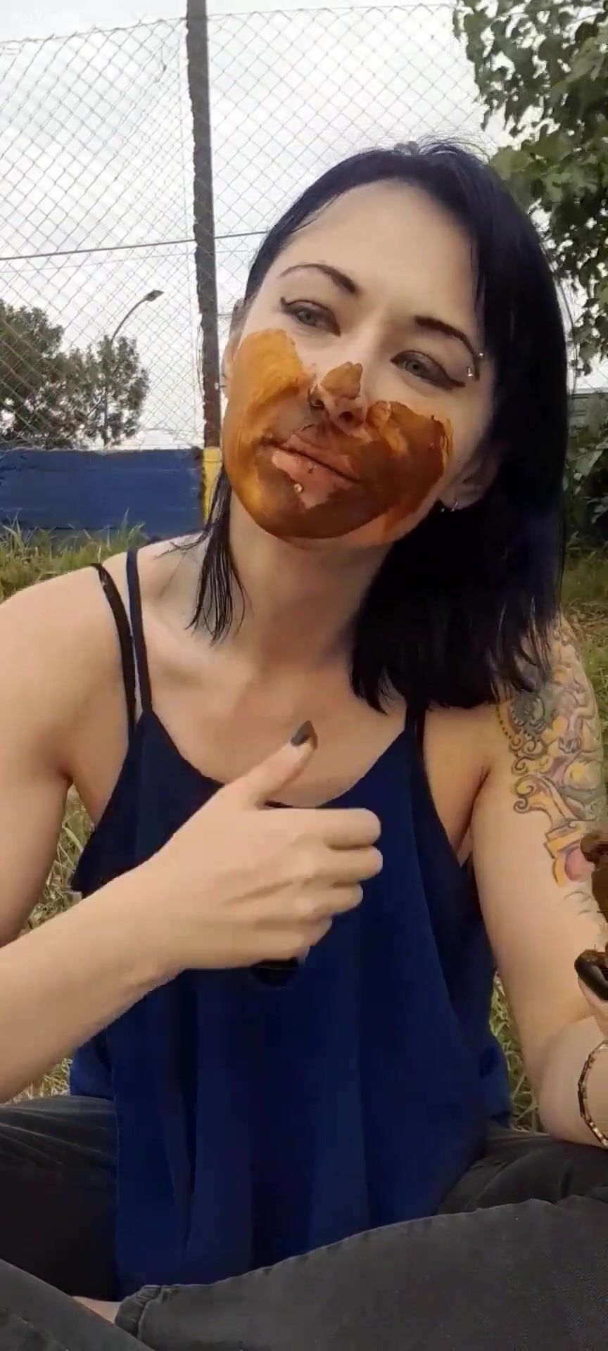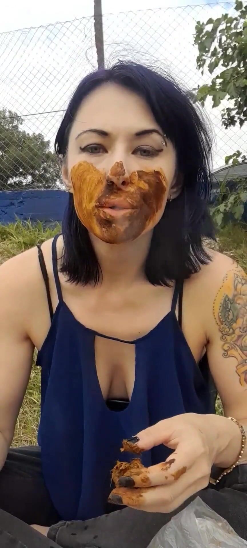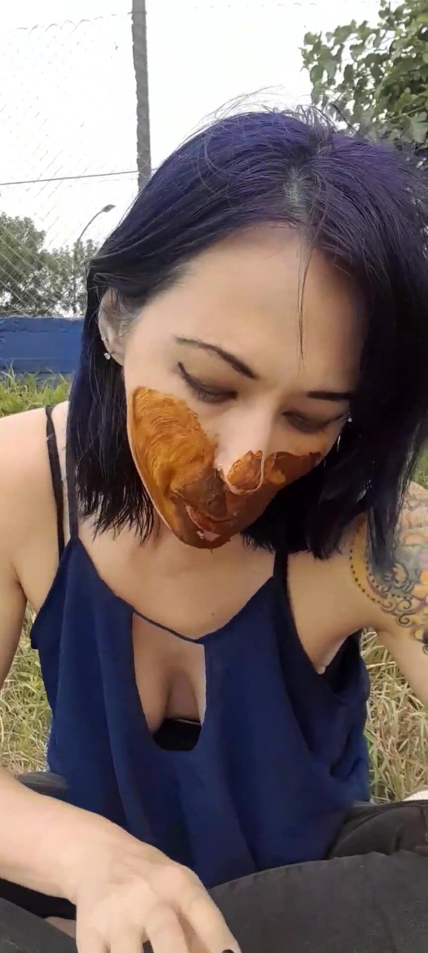 pink-haired girl smears and licks her own shit