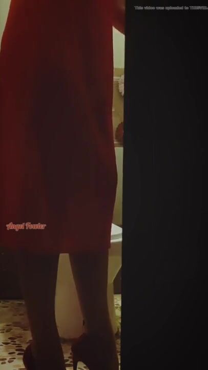 Girl in a red dress pissing at a party