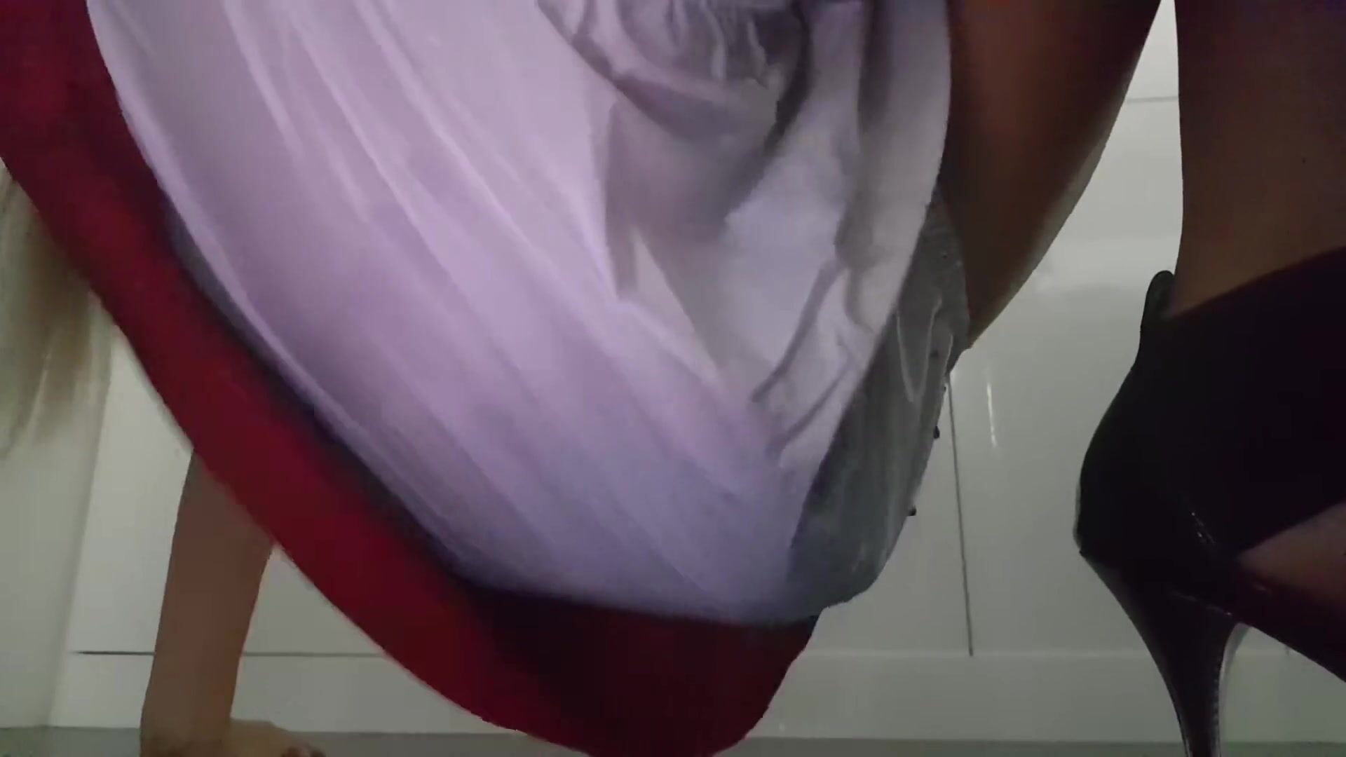 Plastic panties poop under red dress