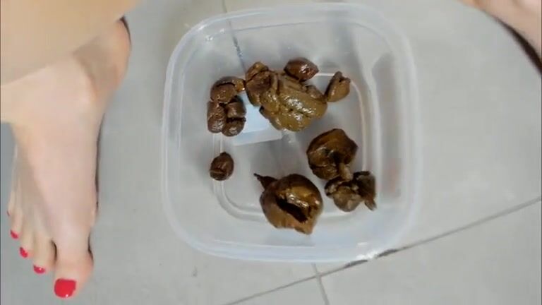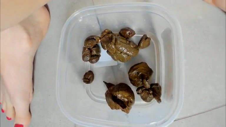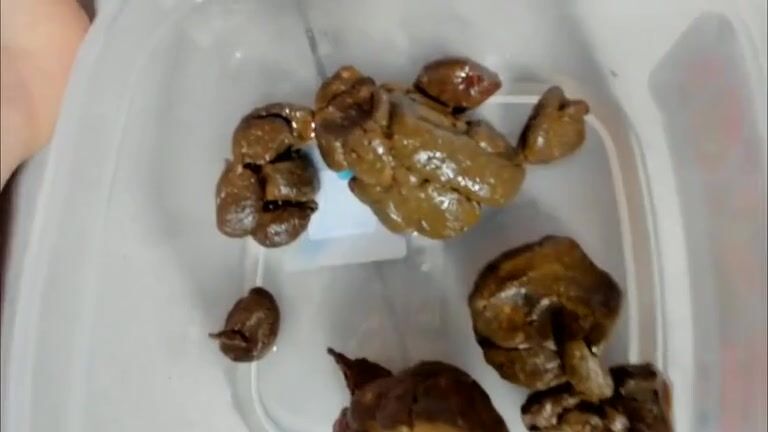girl shits stone like turds in a container