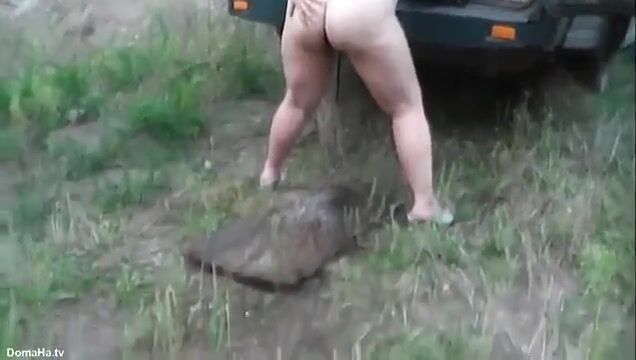 Полненькая жена получает клизму в фургоне на природе