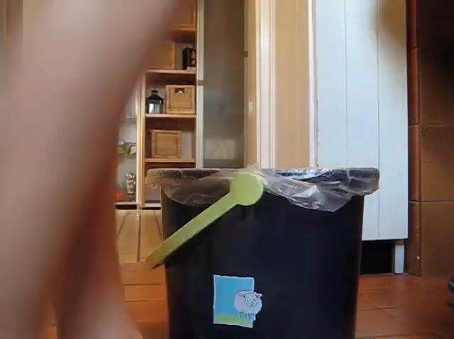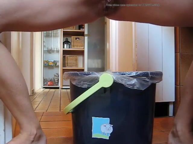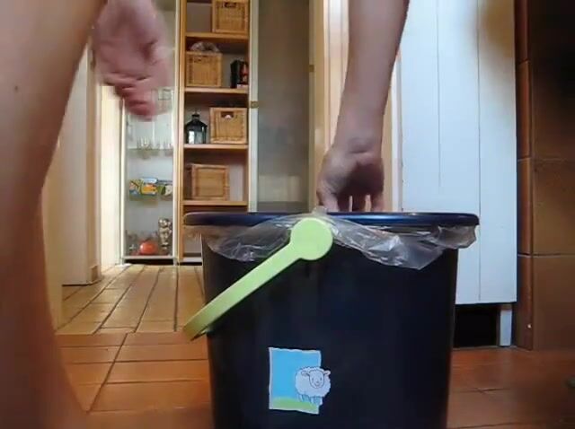 German lady defecates in a trash can..
