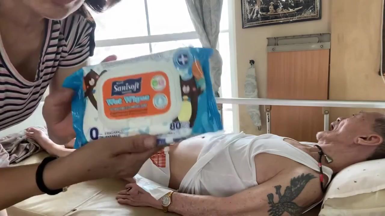 THAI WOMAN CHANGES A POOPY DIAPER FROM AN OLD MAN
