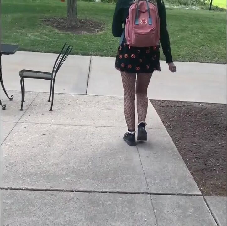 walking across the campus with a shit in her diaper