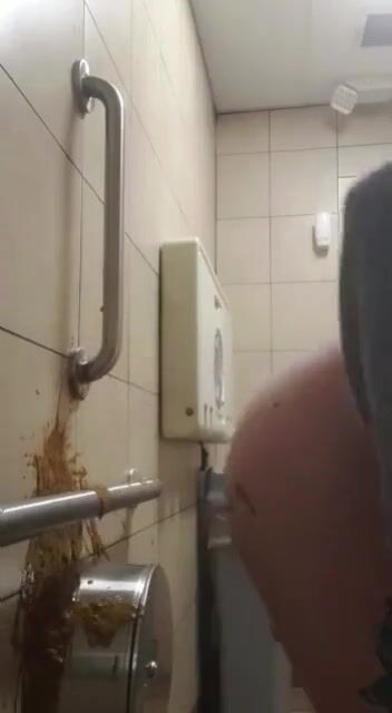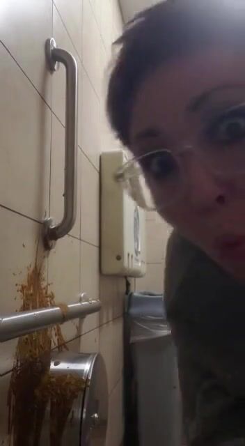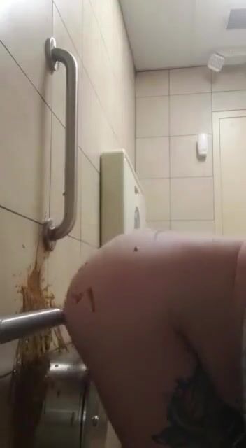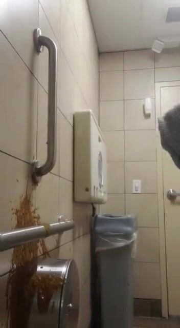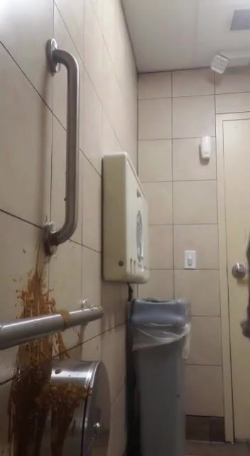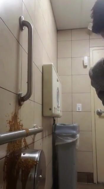 Woman has diarrhea on bathroom wall