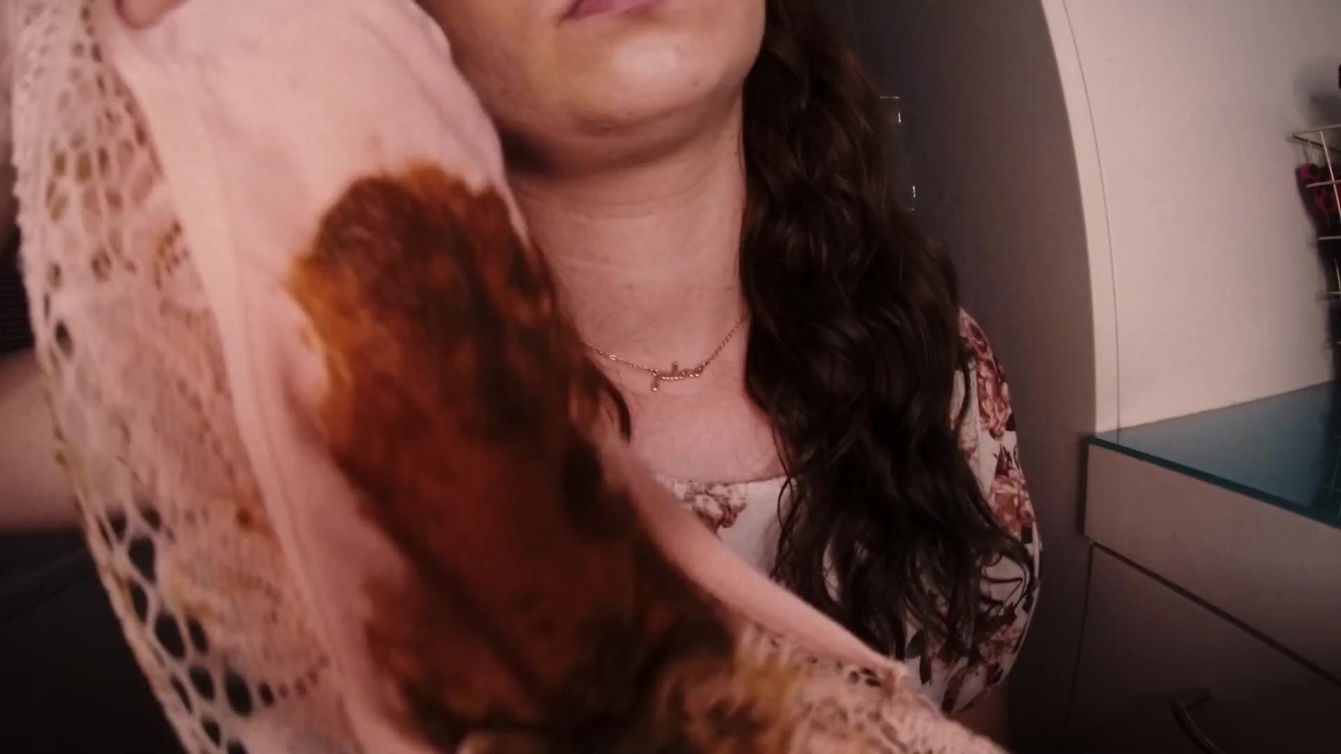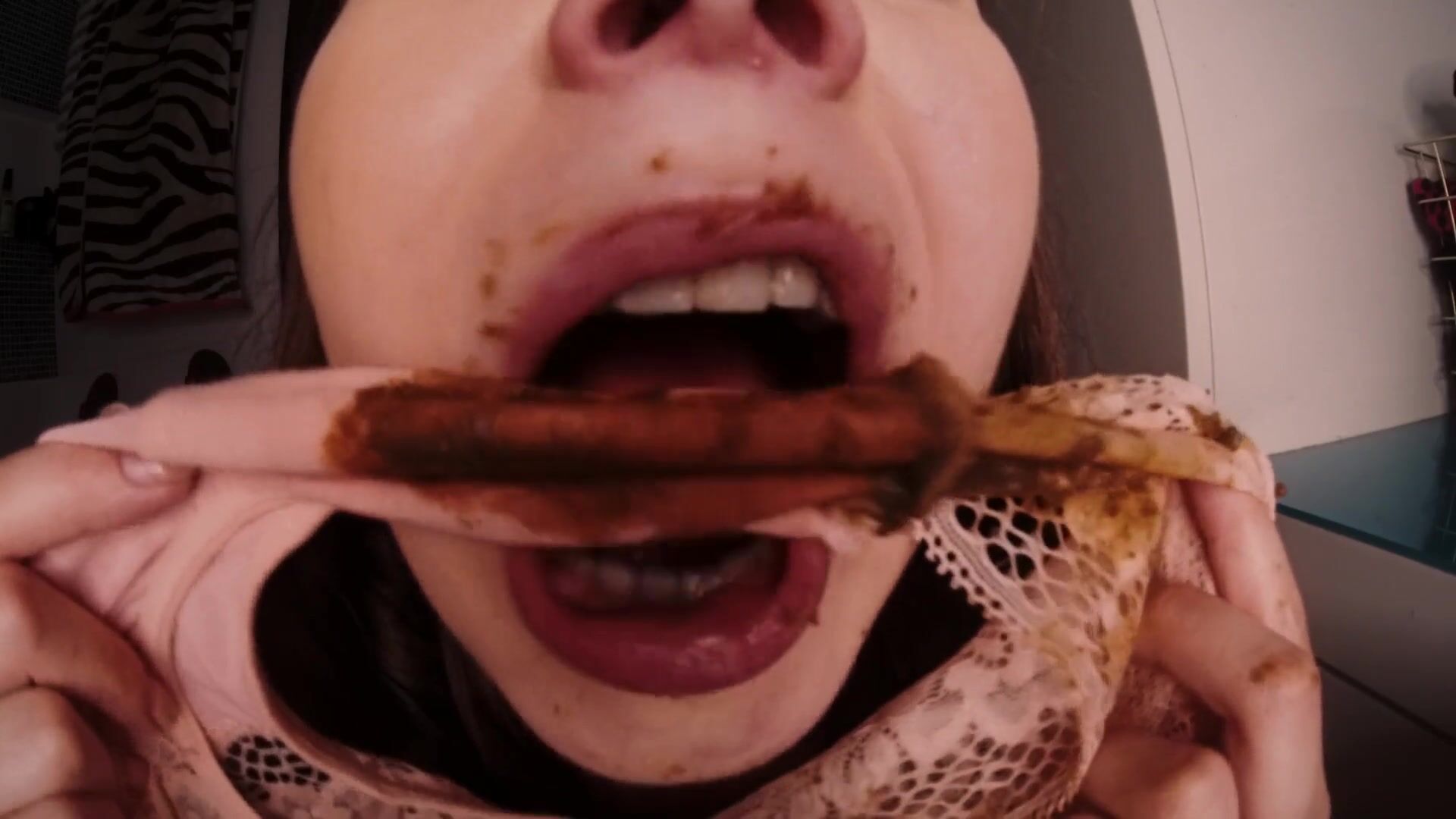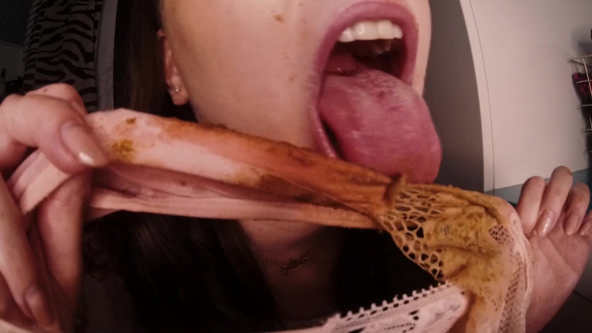slut chews shitty panties close up