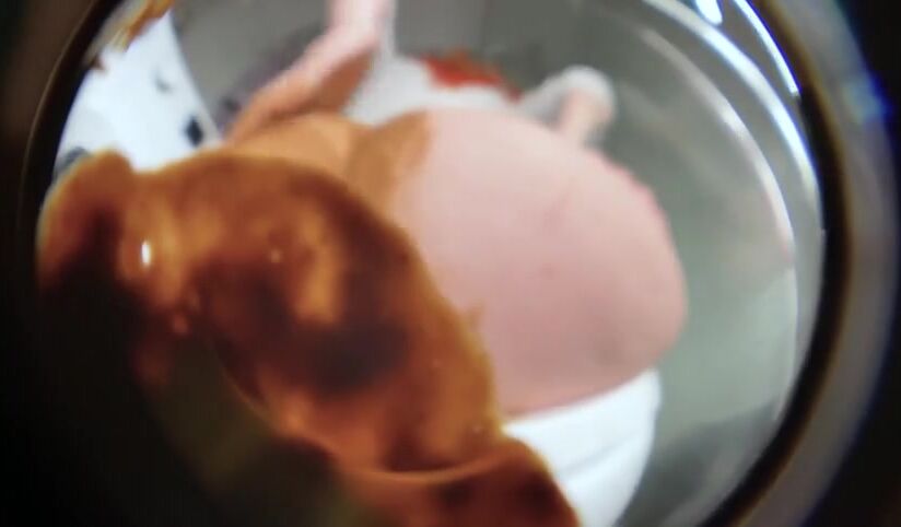 Woman on her side births huge turd.