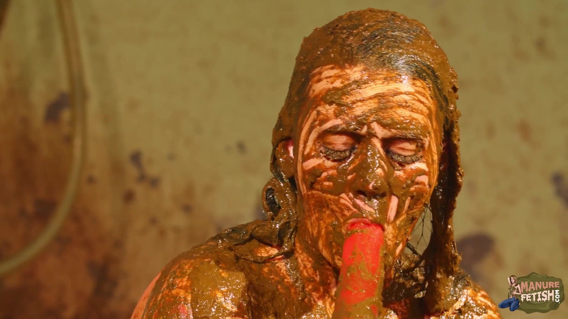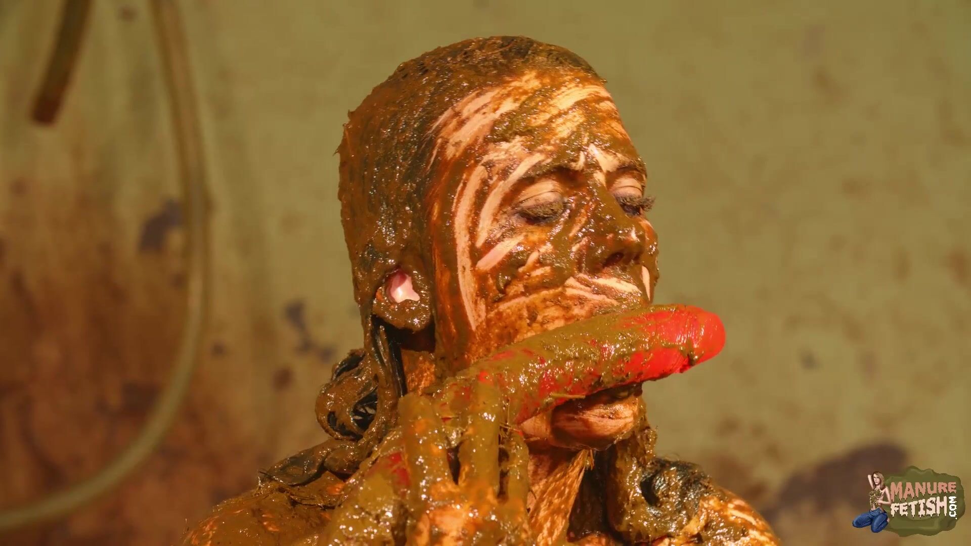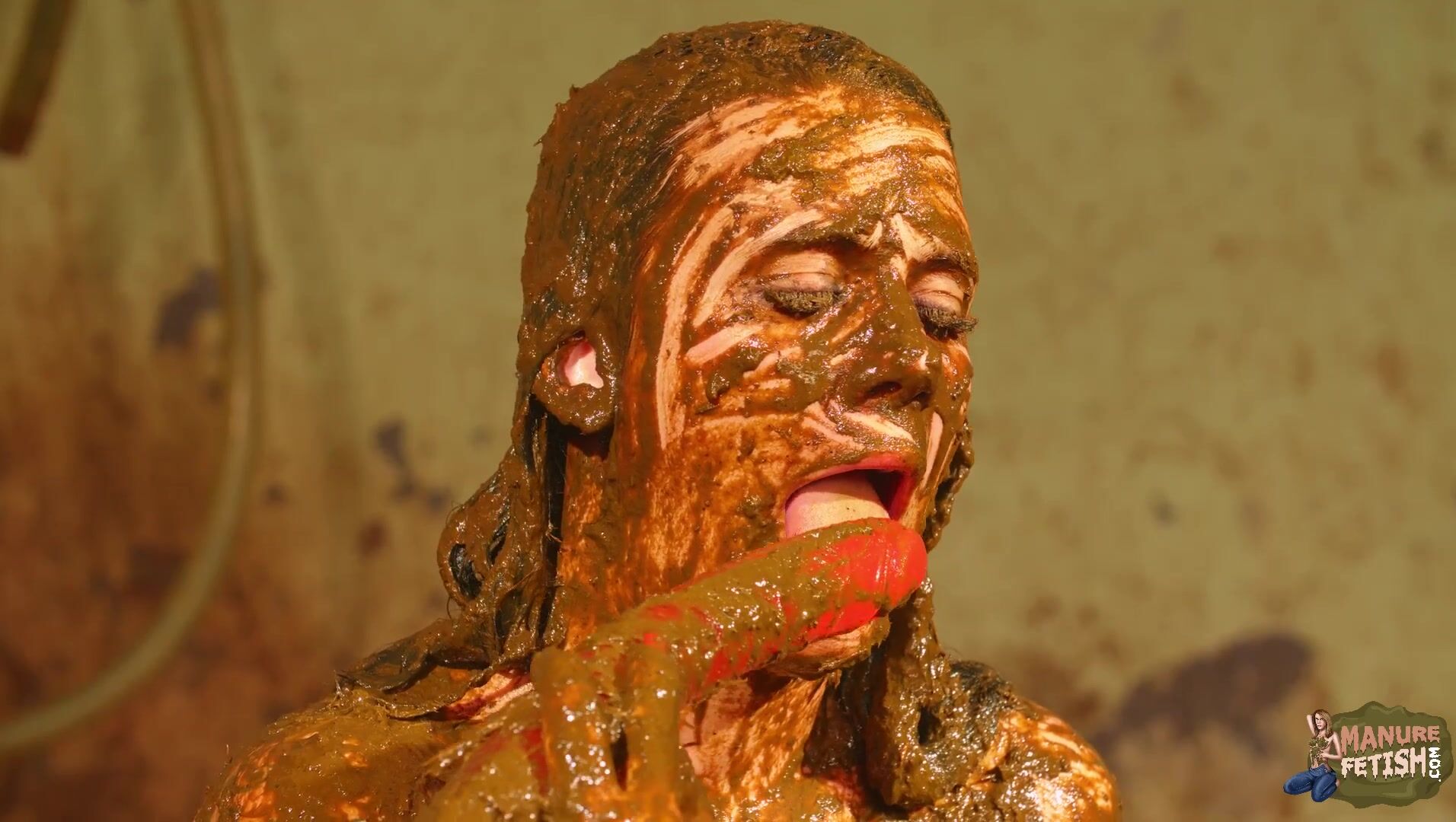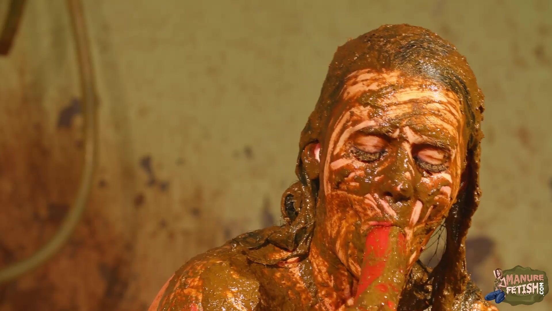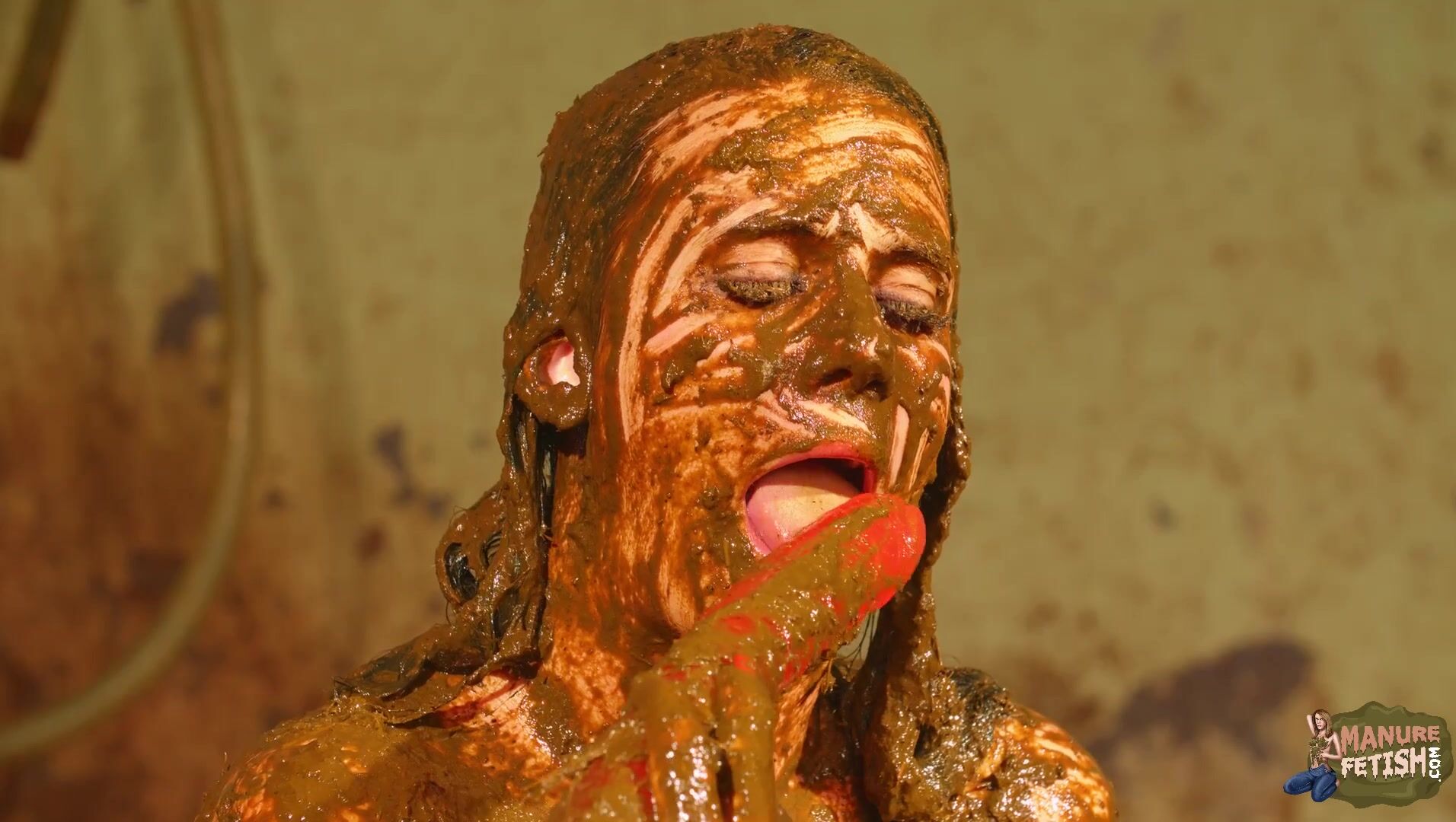 Betty licks the cowshit covered dildo
