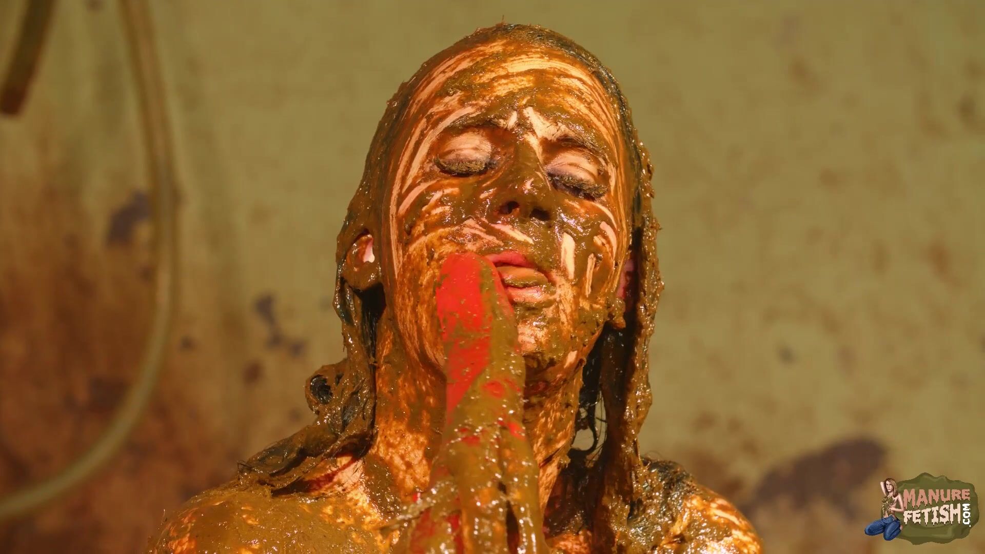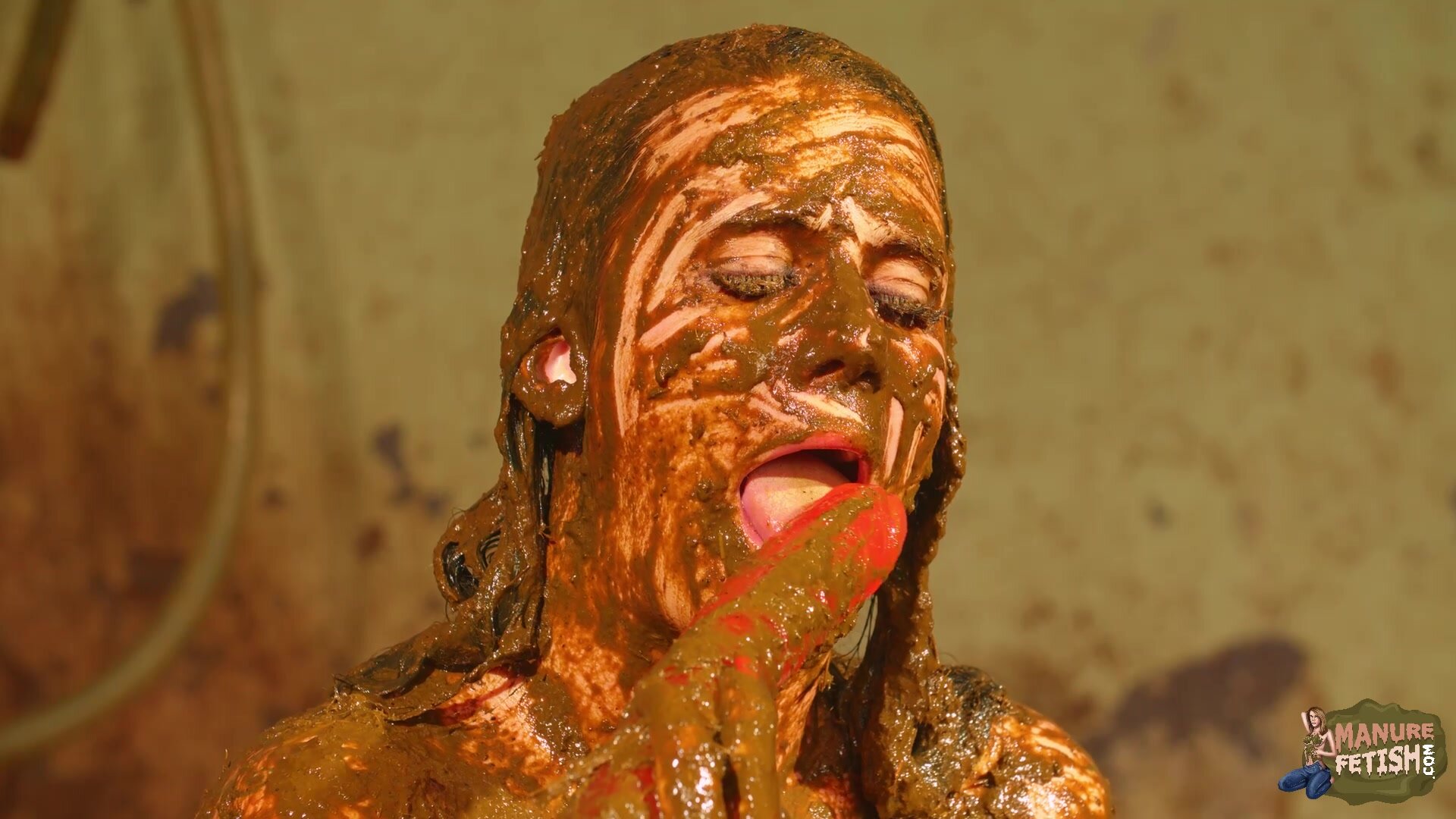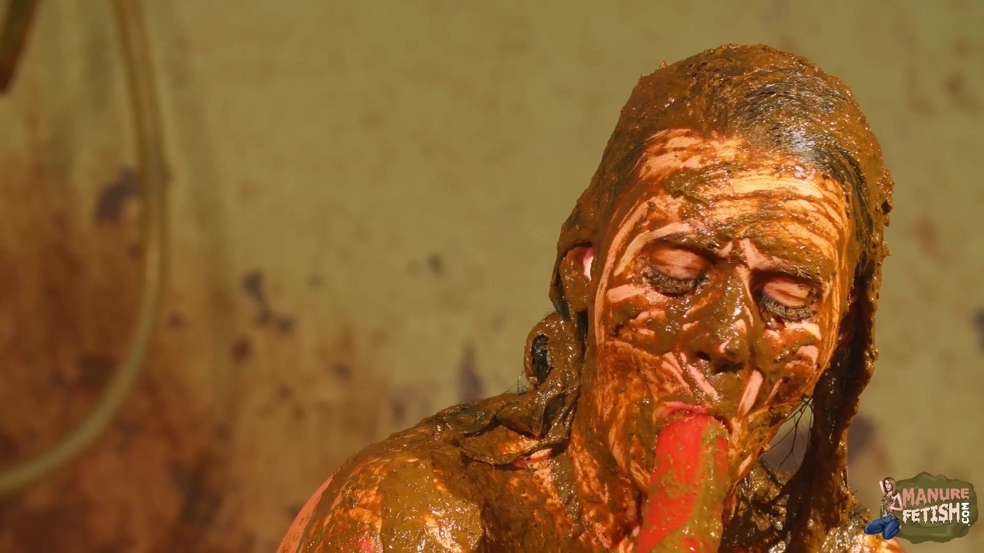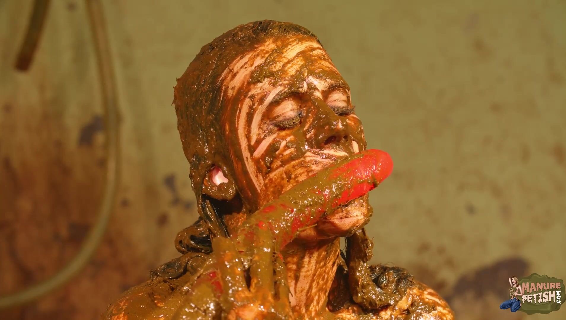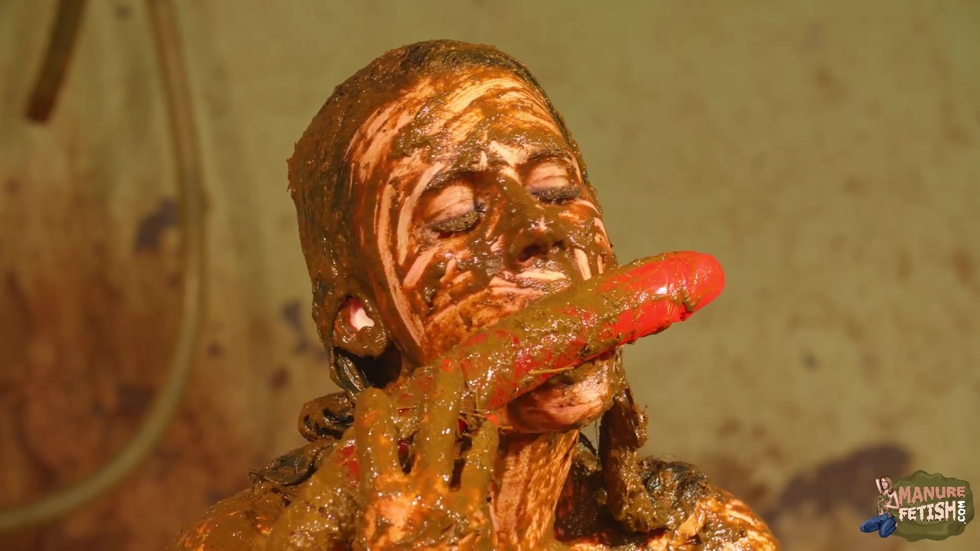 Betty licks the cowshit covered dildo