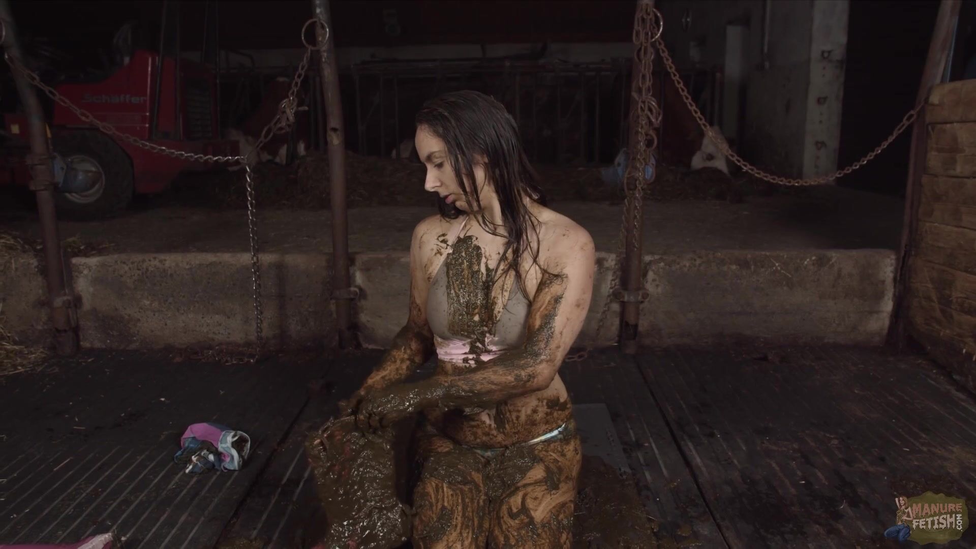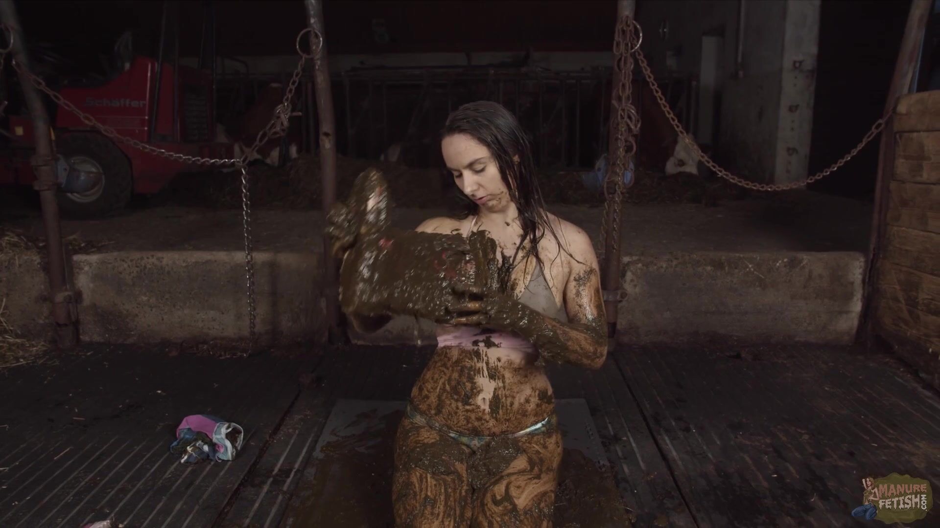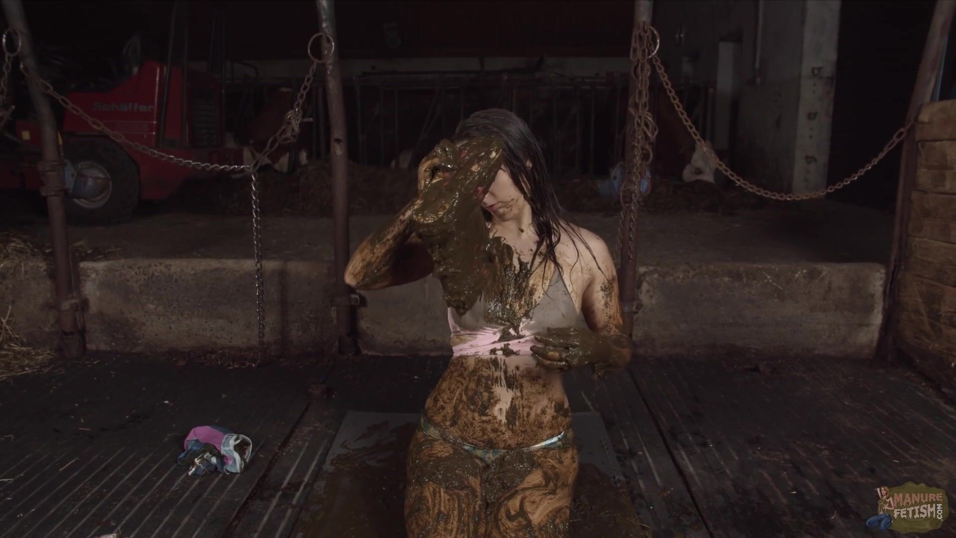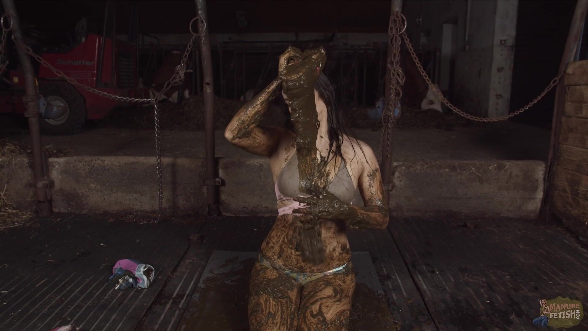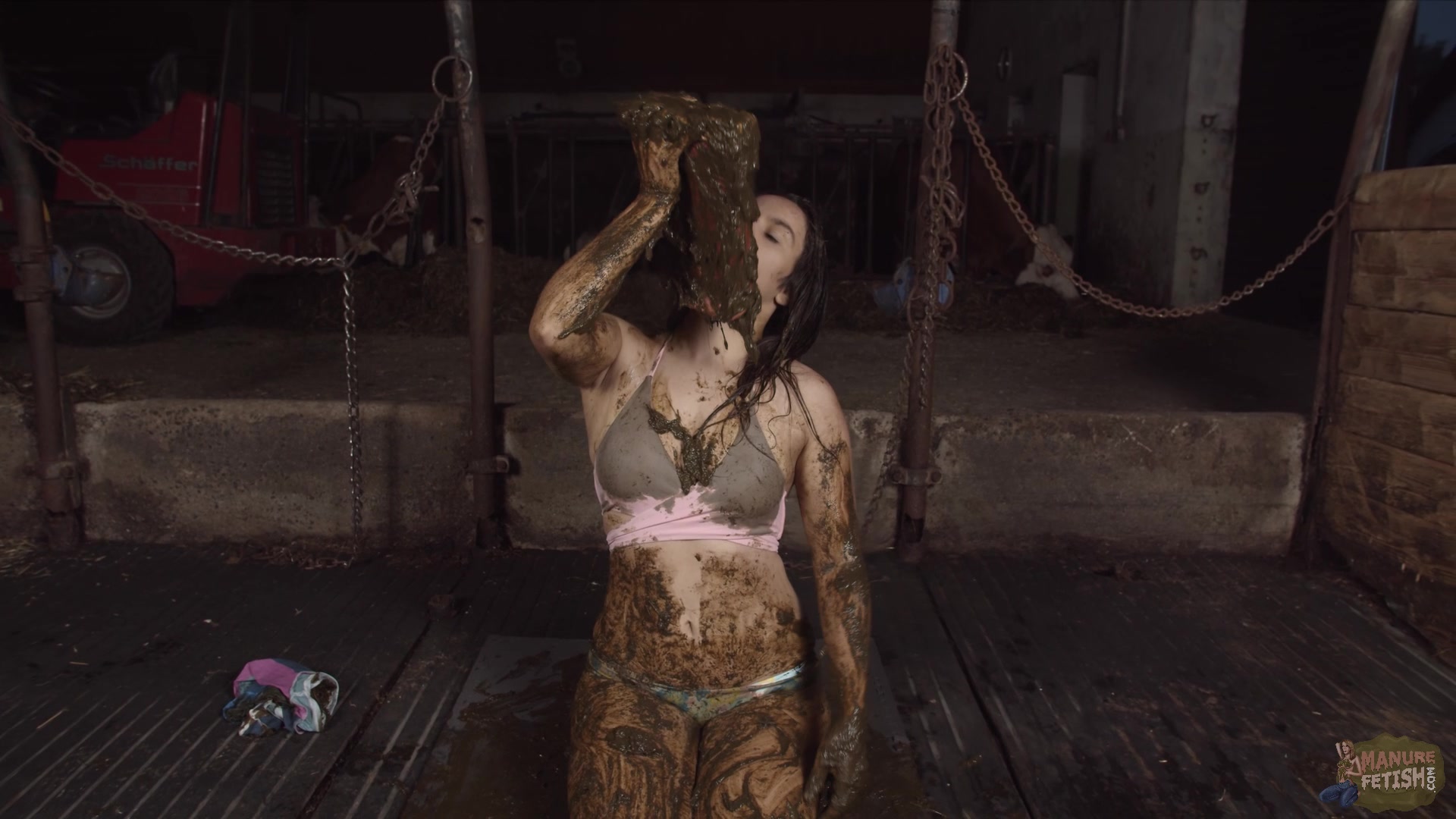 Girl pours shit over her chest and breasts