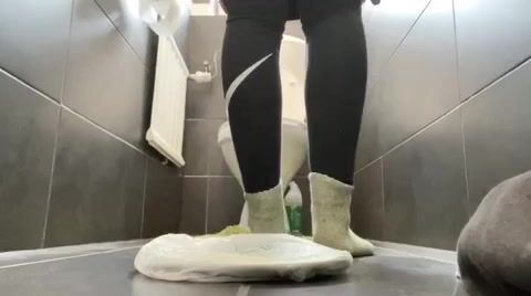 Girl open wide legs and shitting on the toilet floor