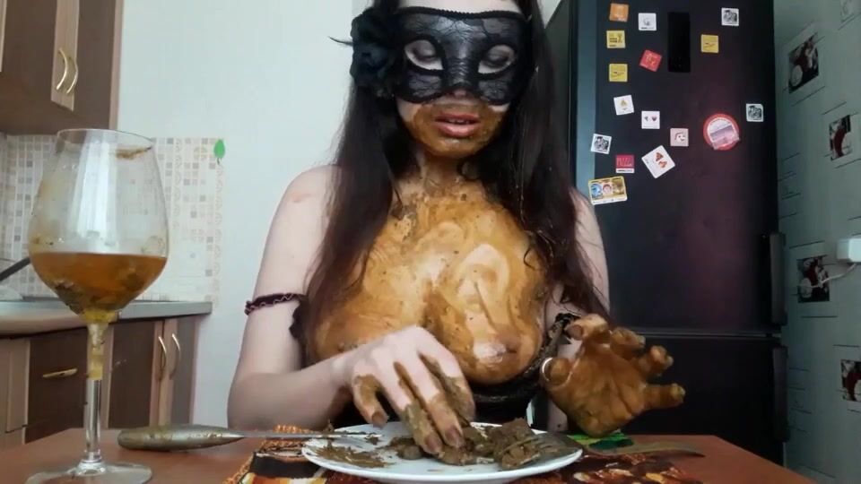 masked girl eats a shitty dinner