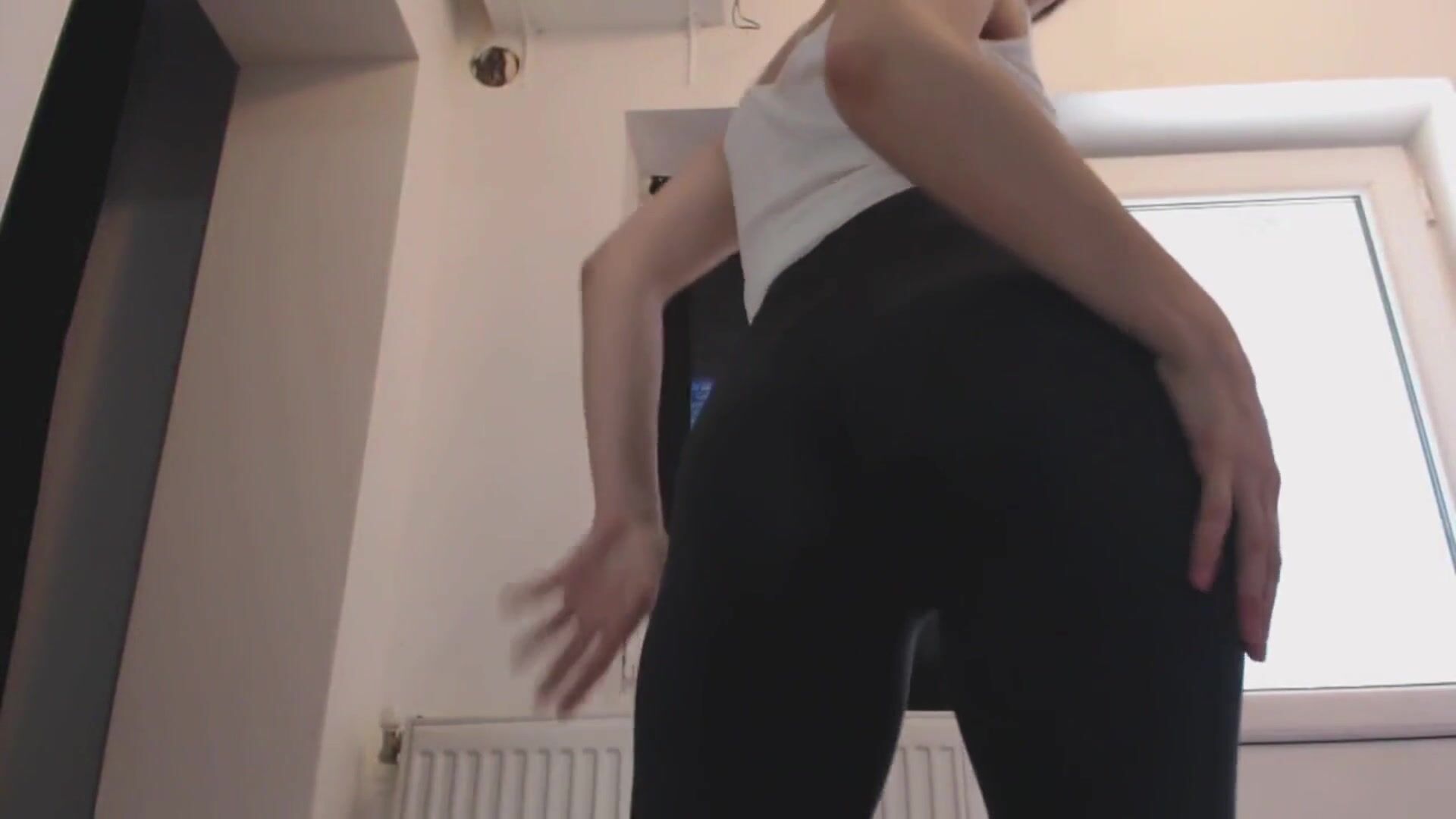 Sexy blonde woman pooping in black leggings