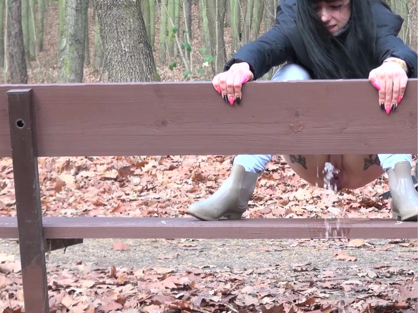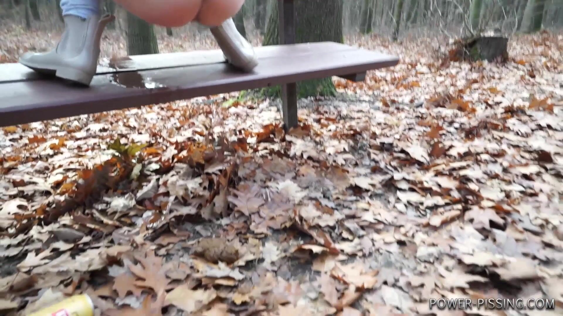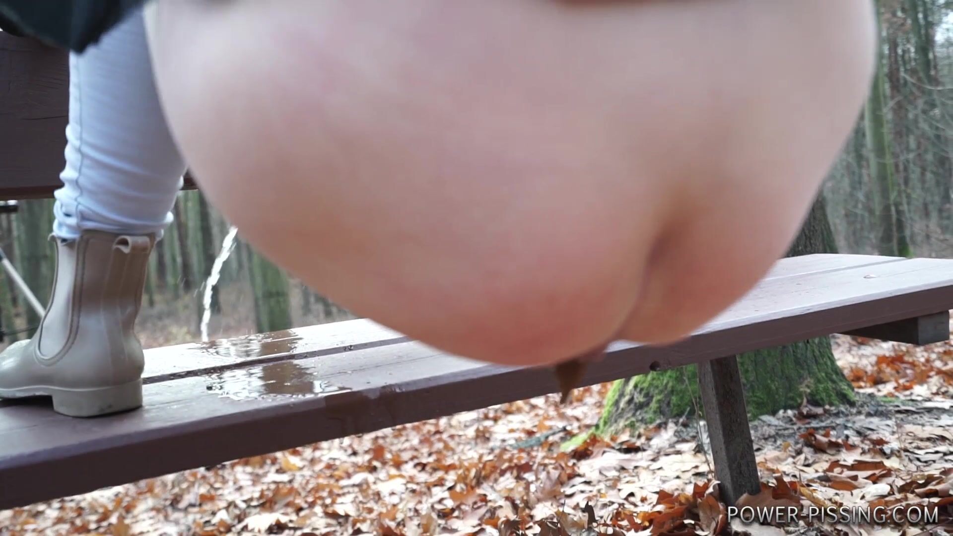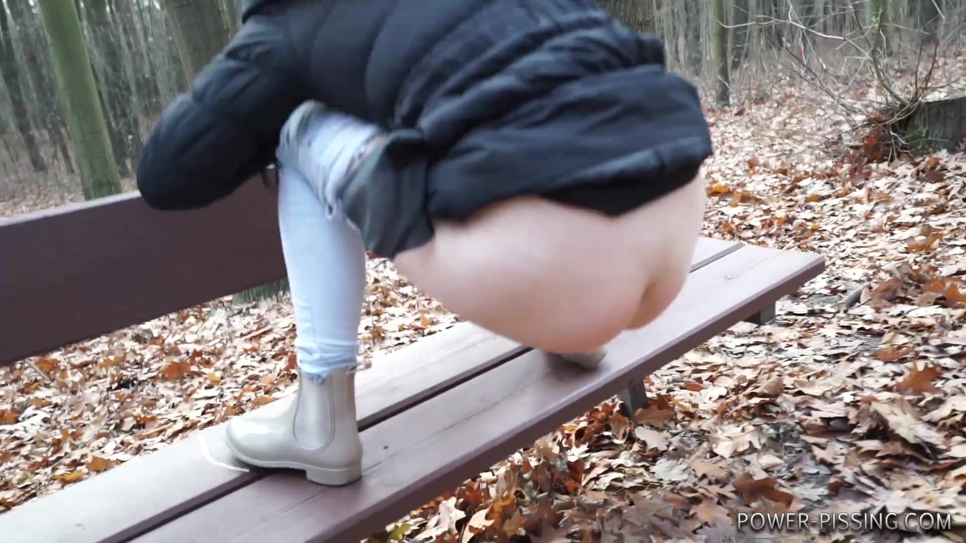 Anni pooping on a bench