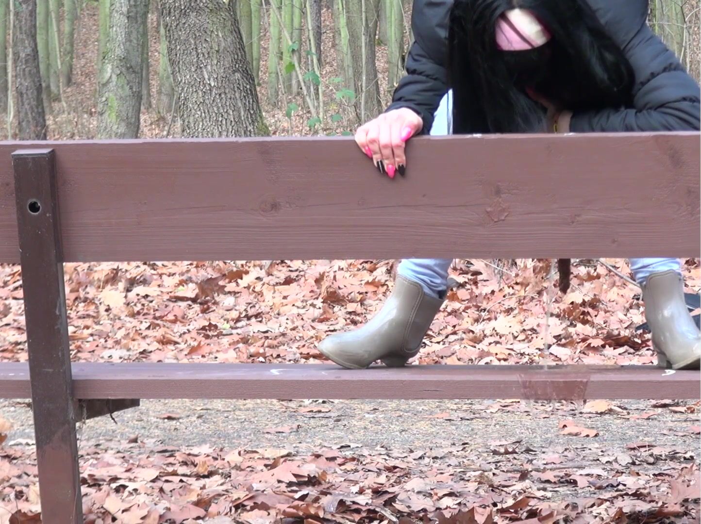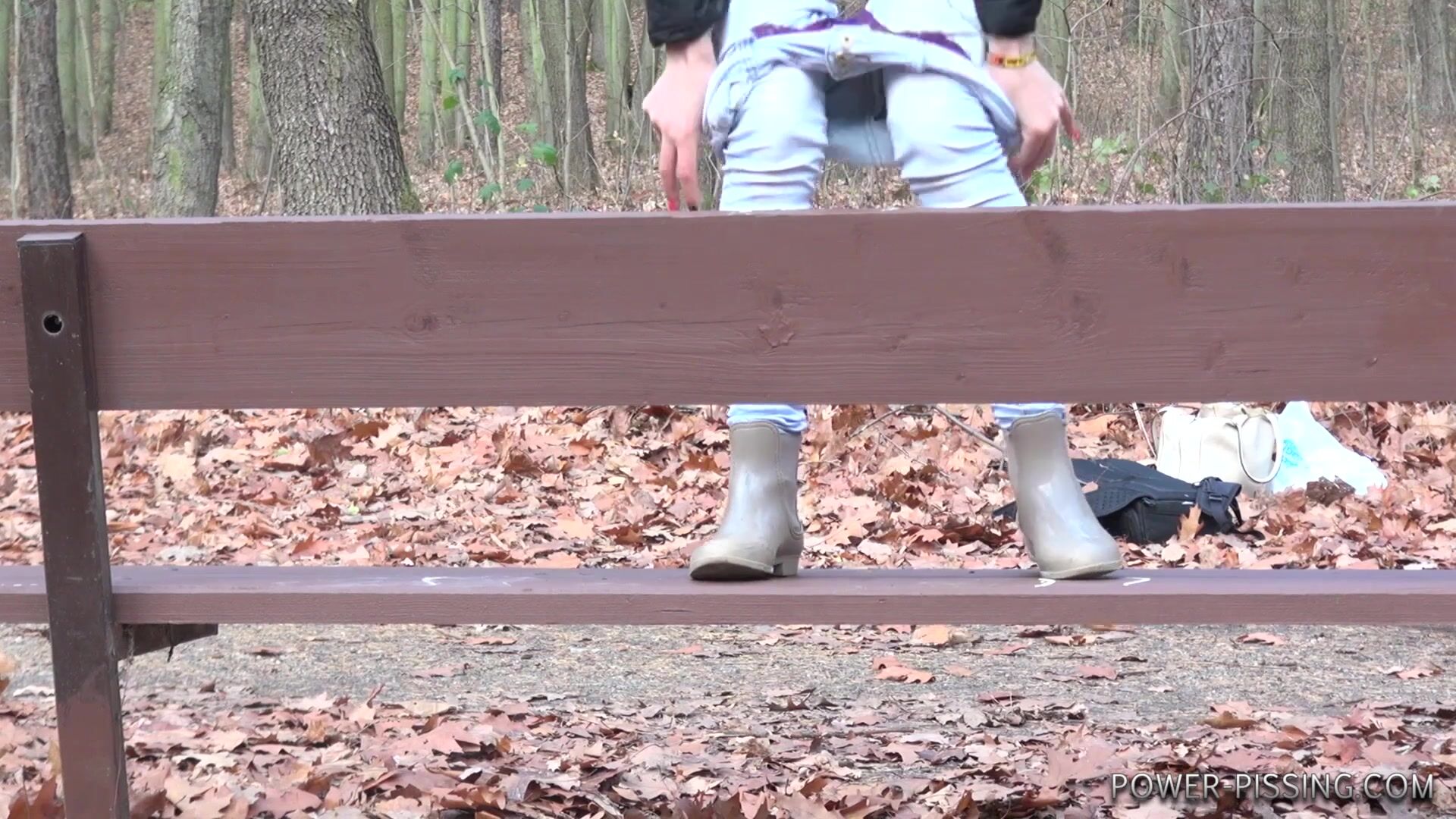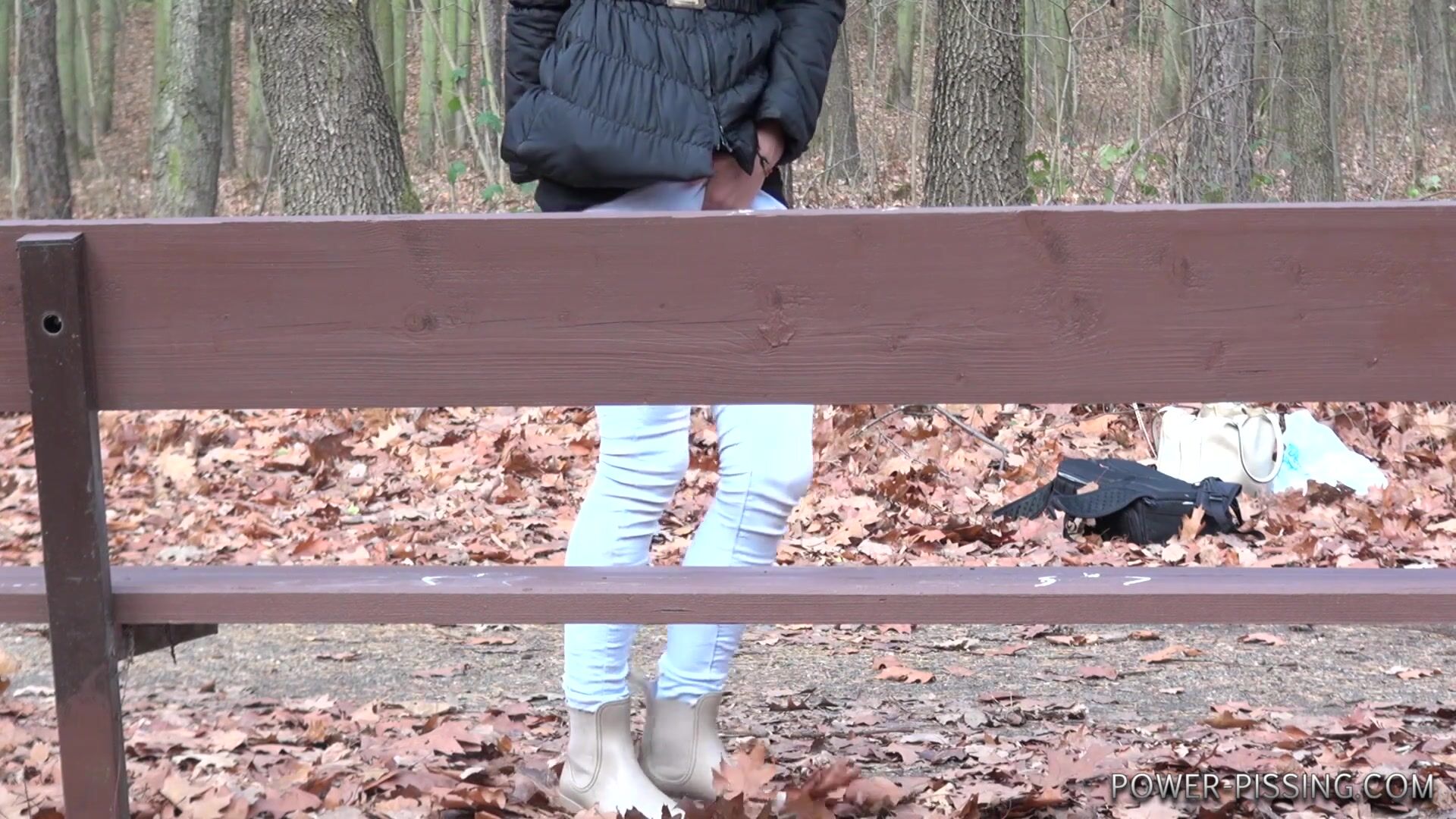 Anni pooping on a bench
