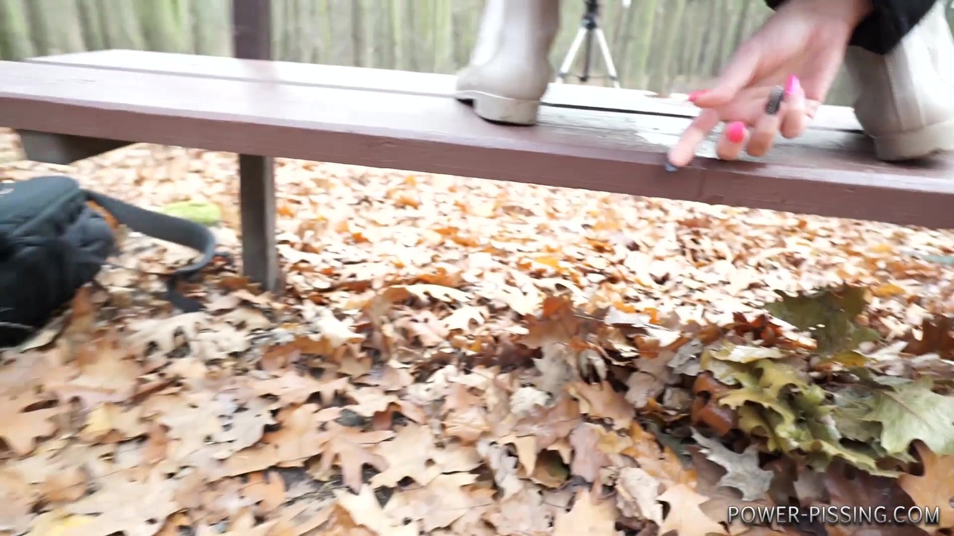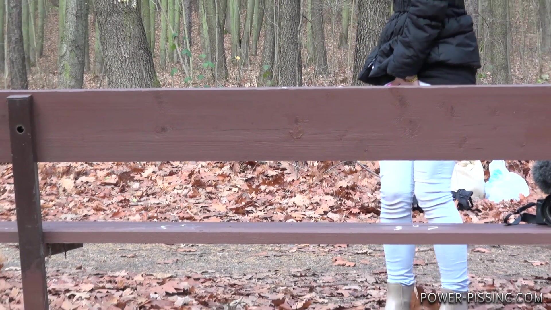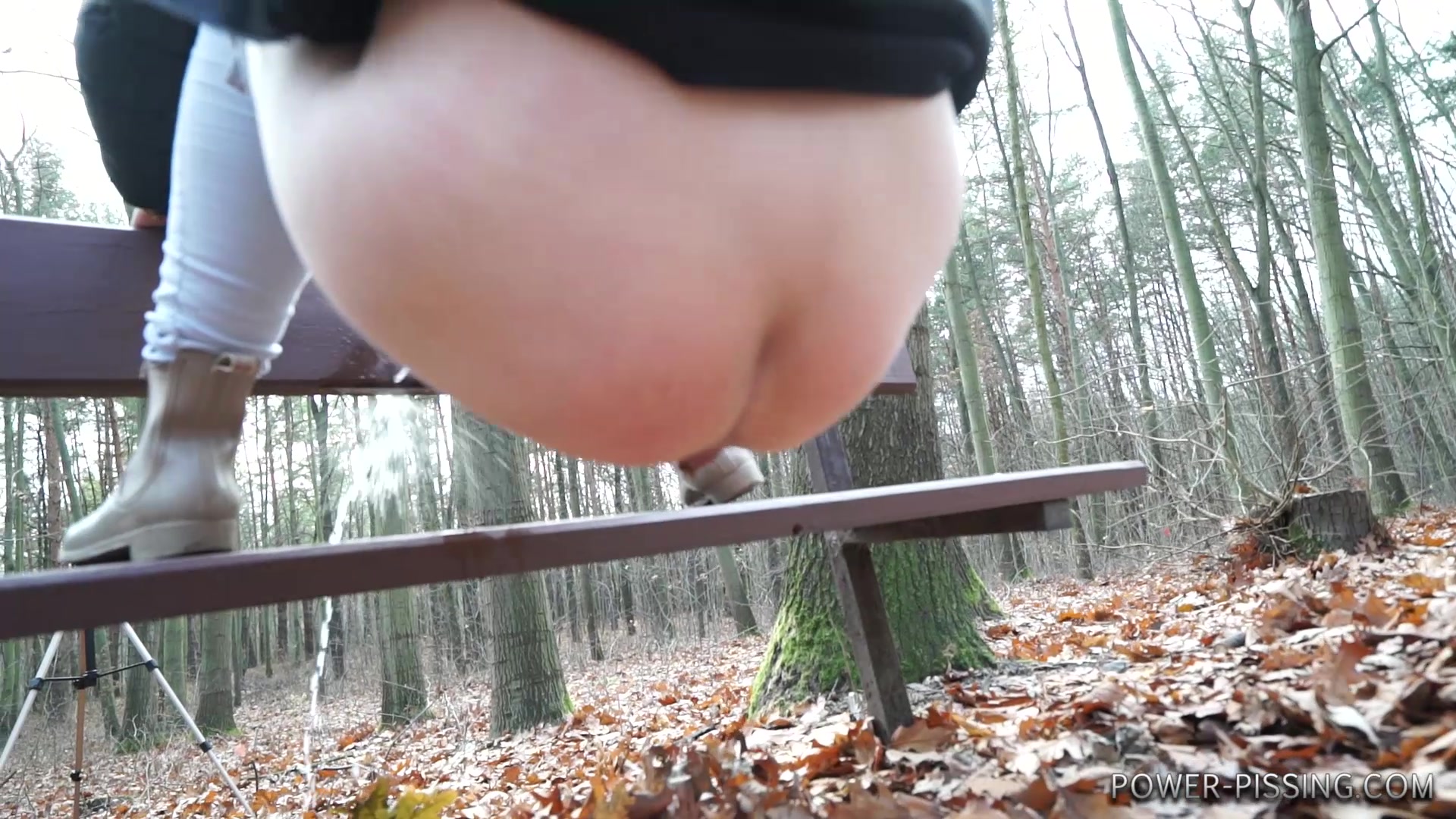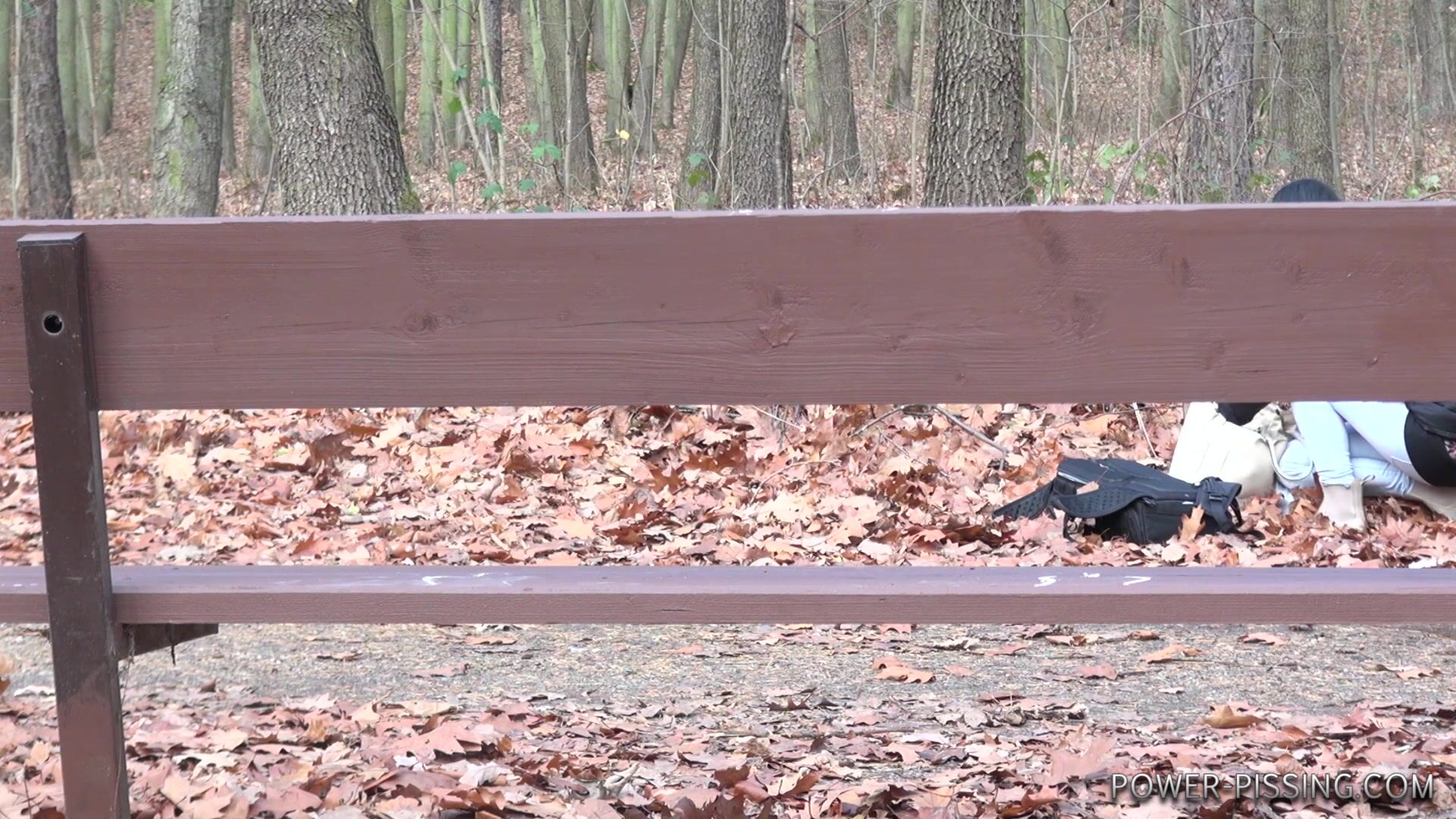 Anni pooping on a bench