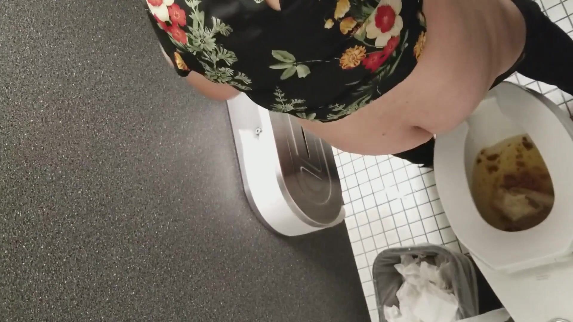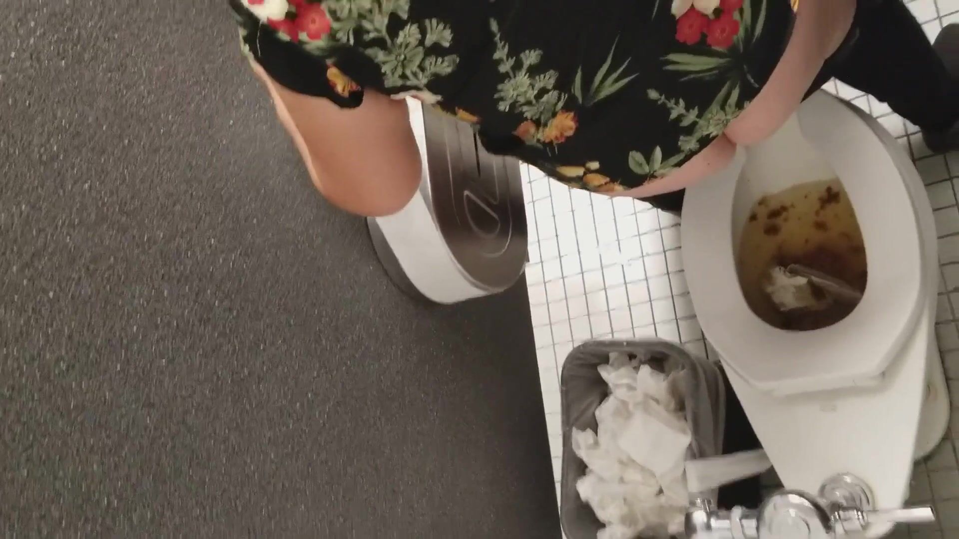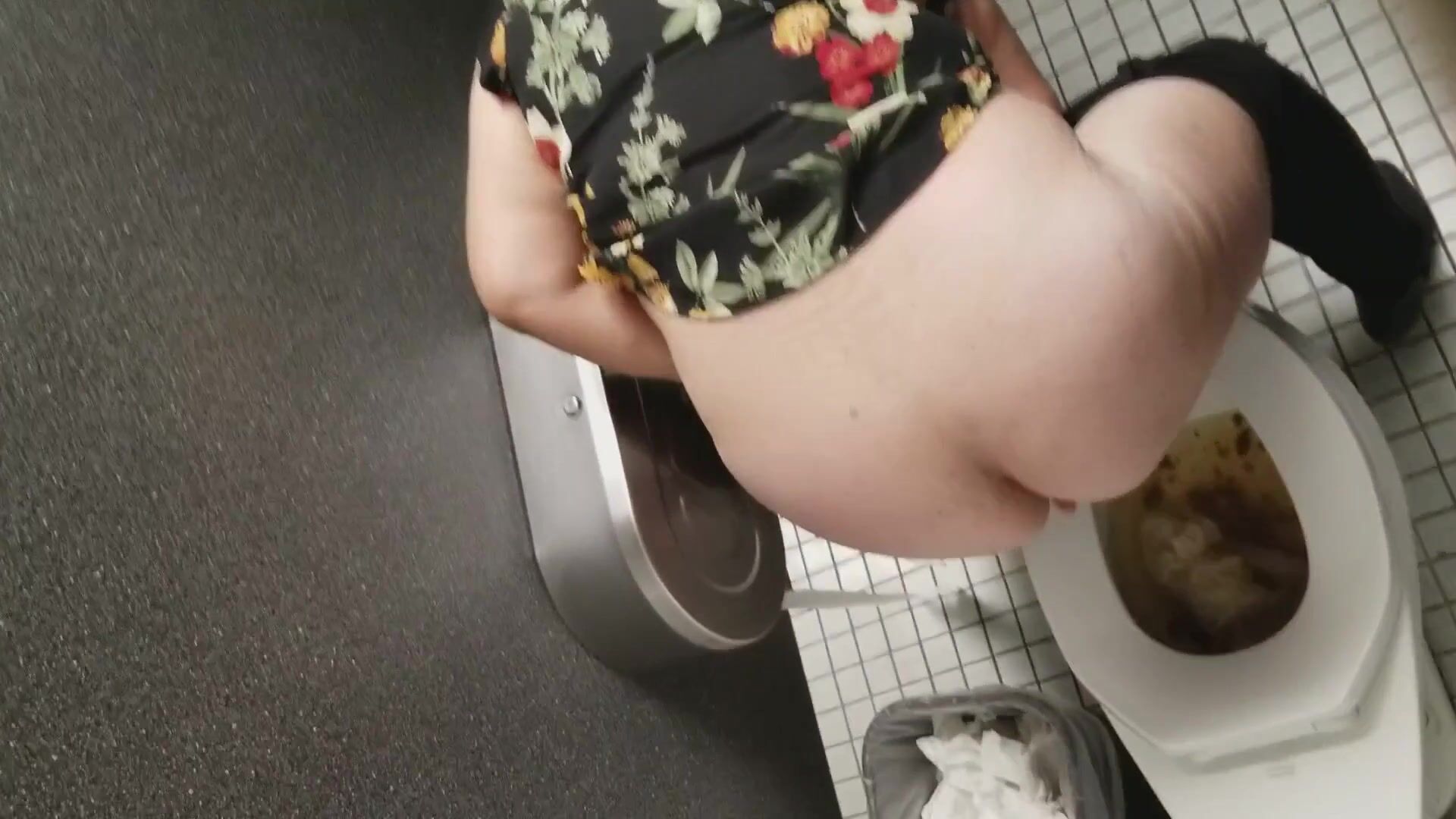 Woman tries to cope with a constipation in the public WC