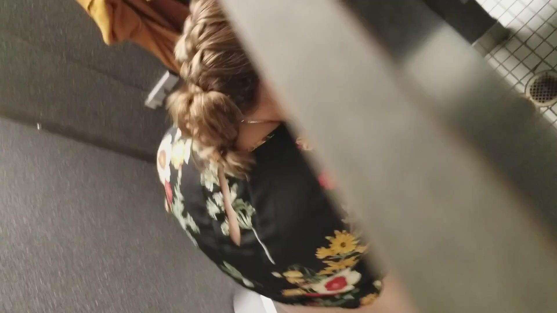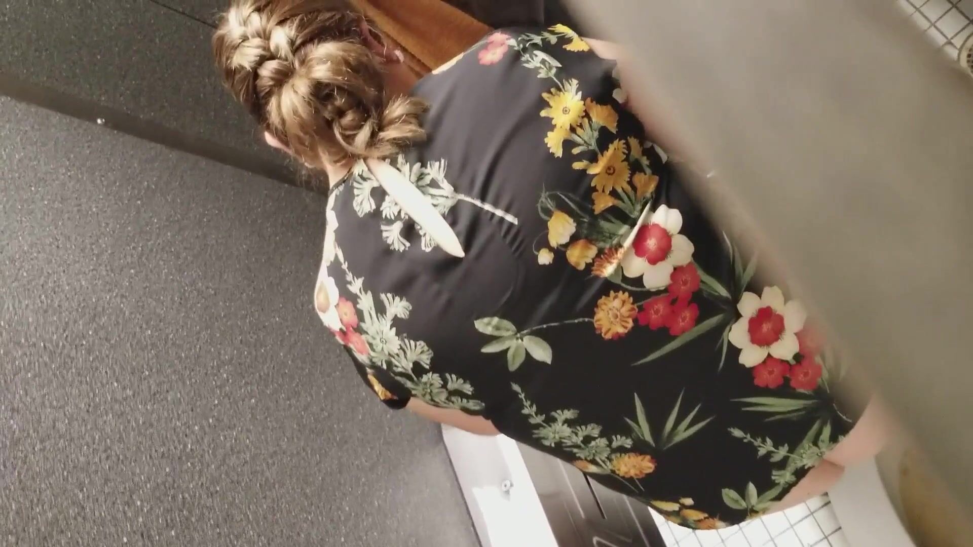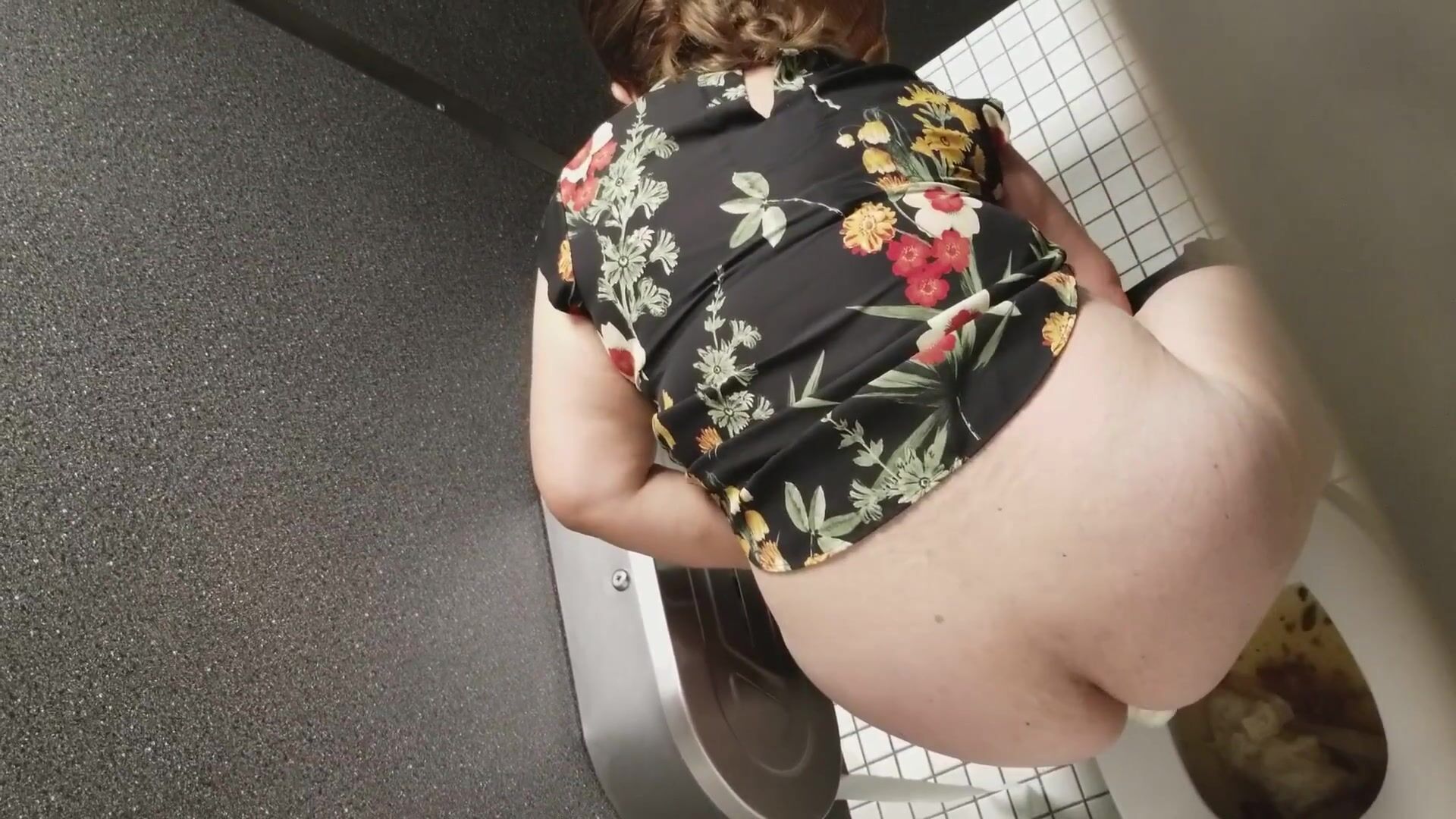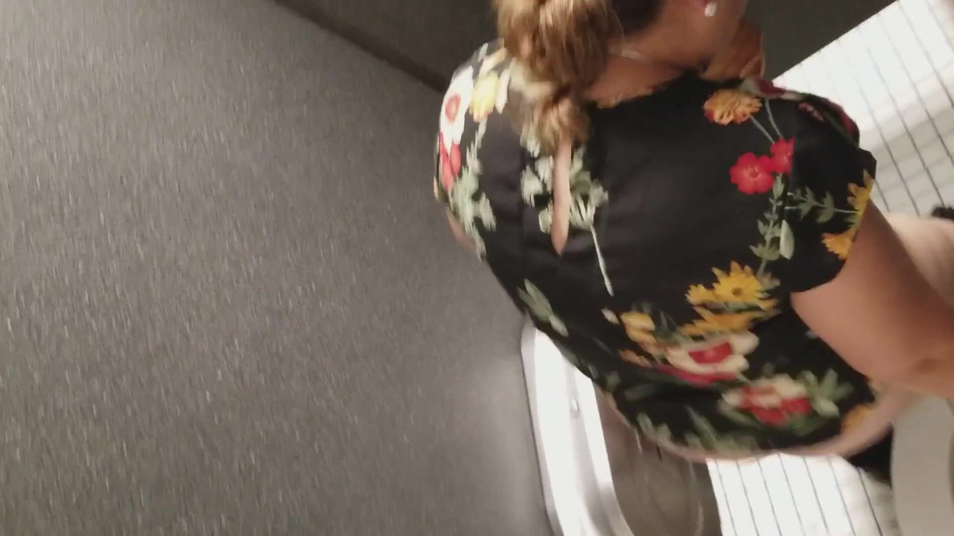 Woman tries to cope with a constipation in the public WC