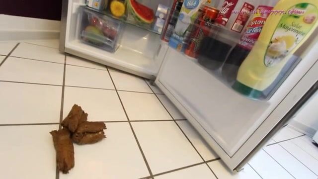 Woman pooping in ftont of the fridge